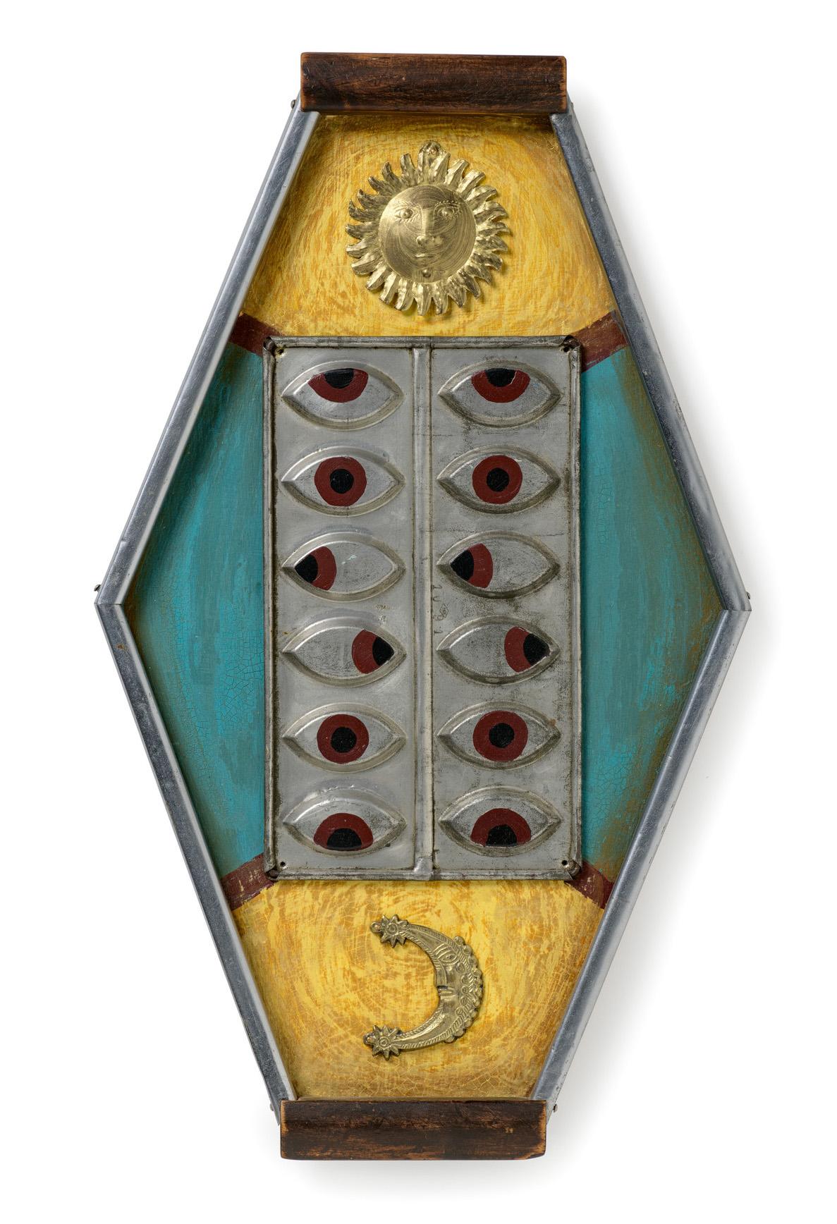 Betye Saar, Eyes of the Beholder, 1994. Paint on metal and wood serving tray, with painted metal baking pan and metal ornaments.