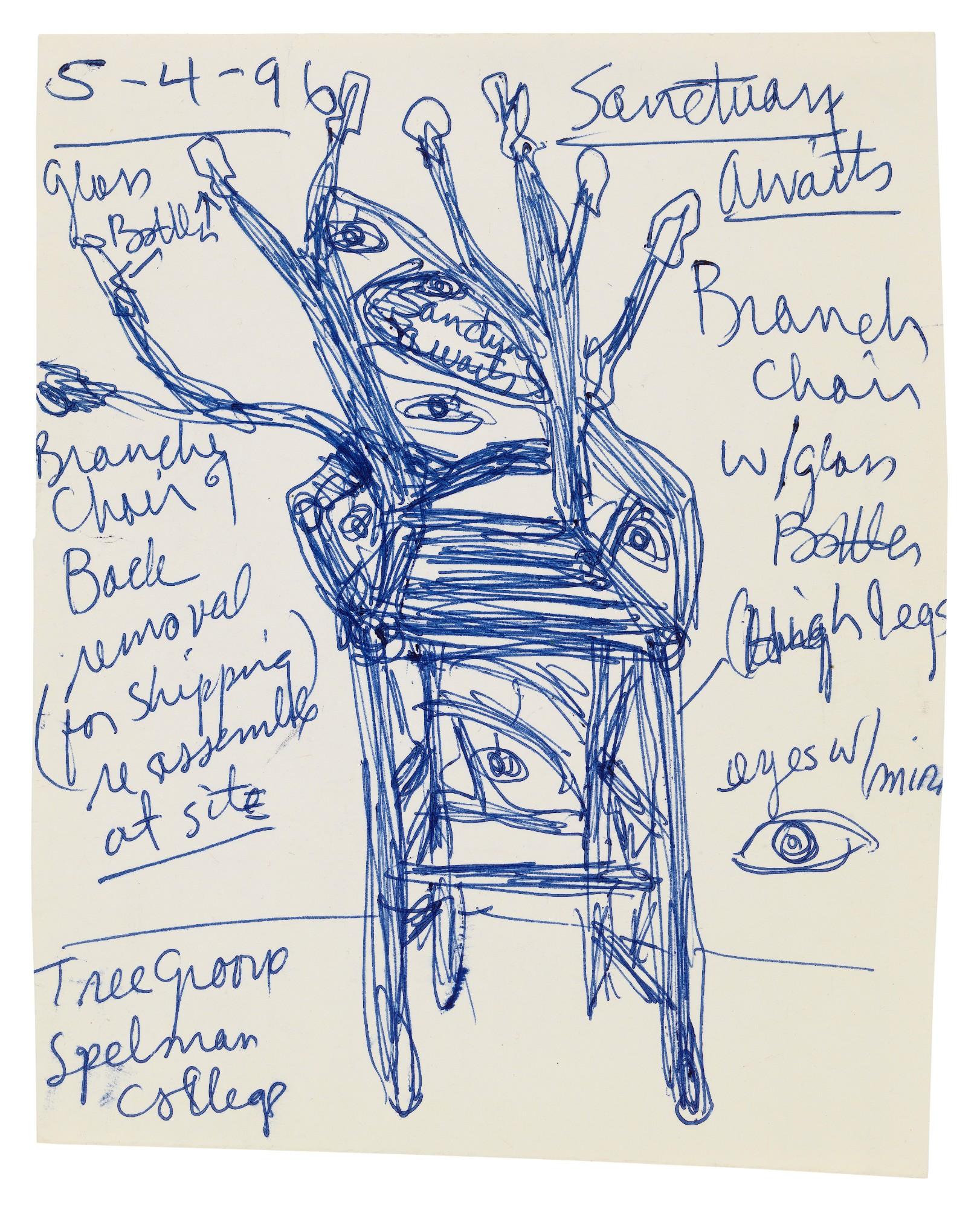 Betye Saar, Sketchbook page for "Sanctuary Awaits," May 4, 1996. Ballpoint pen.