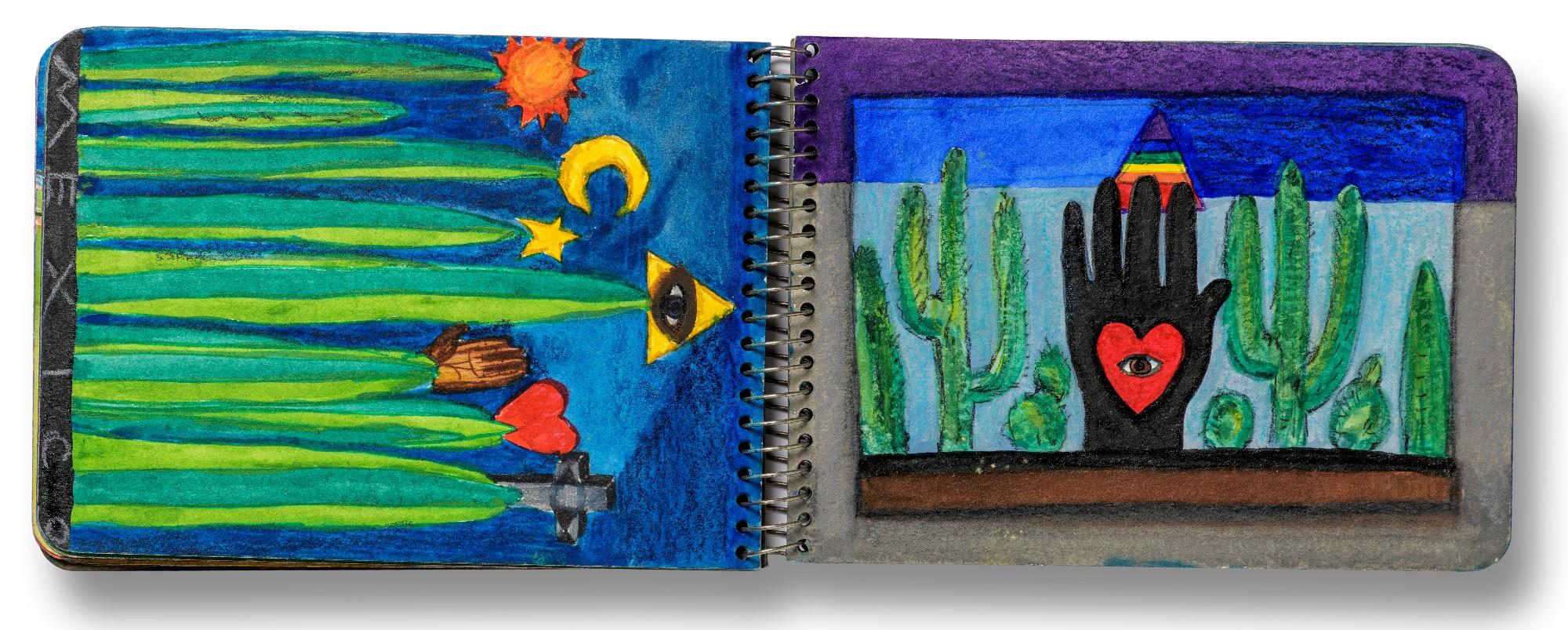 Betye Saar, Spread from Mexico sketchbook, June 1975. Gouache, watercolor, and pencil.