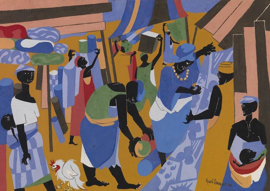 In 1965, Lawrence presented 13 tempera and gouache paintings and nine crayon and ink drawings of Lagos and Ibadan marketplaces at the Terry Dintenfass Gallery in New York. These images were the culmination of a nine-month stay in Nigeria hosted by German cultural critic Ulli Beier, one of the founders of the Mbari Artists and Writers Club. Lawrence's residency in Nigeria placed him and his practice in conversation with Mbari Club members, an international consortium of artists, dramatists and writers in post-Independence Nigeria, including prominent figures within modern African art and literature such as Bruce Onobrakpeya, Vincent Kofi, Wole Soyinka and Chinua Achebe. They created the arts journal Black Orpheus (1957-75) and several other small literary publications to "encourage and discuss contemporary African writing," and soon after, the visual arts. In 1961, the Mbari Club founded a gallery space in Ibadan where they met, socialized and presented exhibitions. Black Orpheus and this gallery space led to numerous artists having their first published art reviews and their first art exhibitions in Nigeria. Among this group of now iconic modernist artists are Lawrence, William H. Johnson, Onobrakpeya, Kofi, Ibrahim El-Salahi, Francis Newton Souza, Suzanne Wenger and Naoko Matsubara.