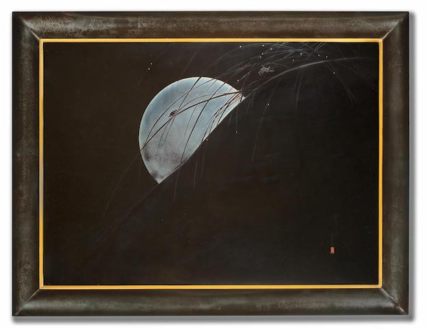 A panel with a highly polished black-lacquer roiro surface worked in relief with the curve of a bank running from top right to bottom left, the moon in silver hiramaki-e merging to silver hirame rising above the bank, curving strands of susuki (plume grass, Miscanthus sinensis) in kuromaki-e (black-on-black maki-e) against the bank and sky, turning to dark brown where they cross the moon, embellished here and there with silver dewdrops, two suzumushi ('bell crickets', Meloimorpha japonicus) on the grasses, in black lacquer takamaki-e, one against the black sky, the other against the moon, all within a removable narrow gold-lacquer border and Western-style frame with curved profile finished in chadō-nuri (a brownish variant of seidō-nuri) perhaps intended to emulate the surface of polished wood.