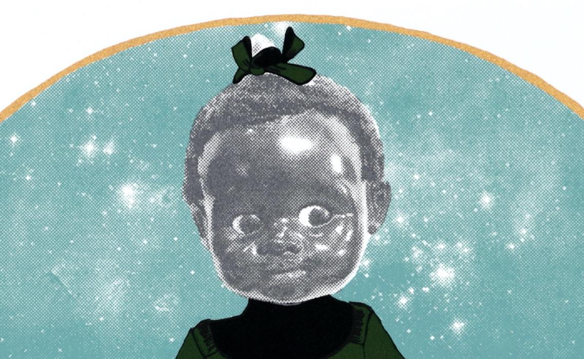 Children of the Sun features two formally distinct bodies of work: a grouping of twelve varied-dimension silkscreens featuring the doll-like figures, and a pair of color lithographs. The color lithographs – Black Boy Hope I and II – respond to the wrongful execution of an innocent fourteen-year-old African-American boy, George Stinney, who was falsely accused of murder with very little evidence (his conviction was overturned in 2014, seventy years after he was killed).