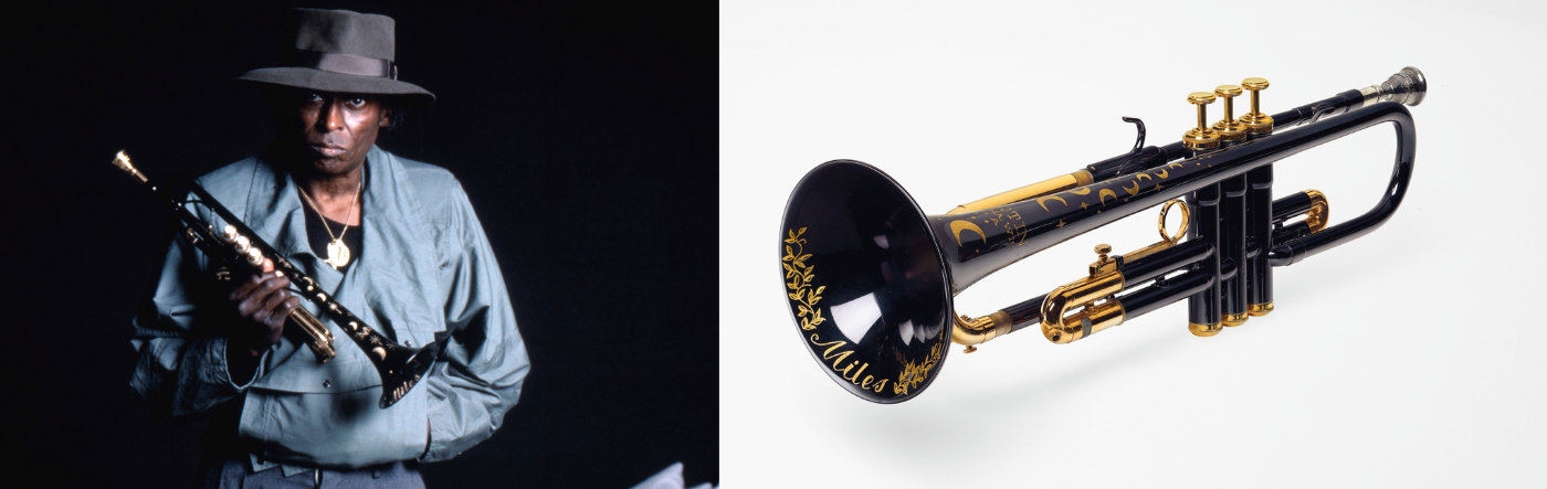 Davis continued to record, perform and innovate in the 1960s and early 1970s, absorbing influences from Stockhausen to soul. By 1975, however, a combination of exhaustion, personal demons and drug addiction forced him to take time out. He wouldn’t pick up a musical instrument again in earnest until the early 1980s, which was when the blue-lacquer ‘Moon and Stars’ trumpet was created for him.