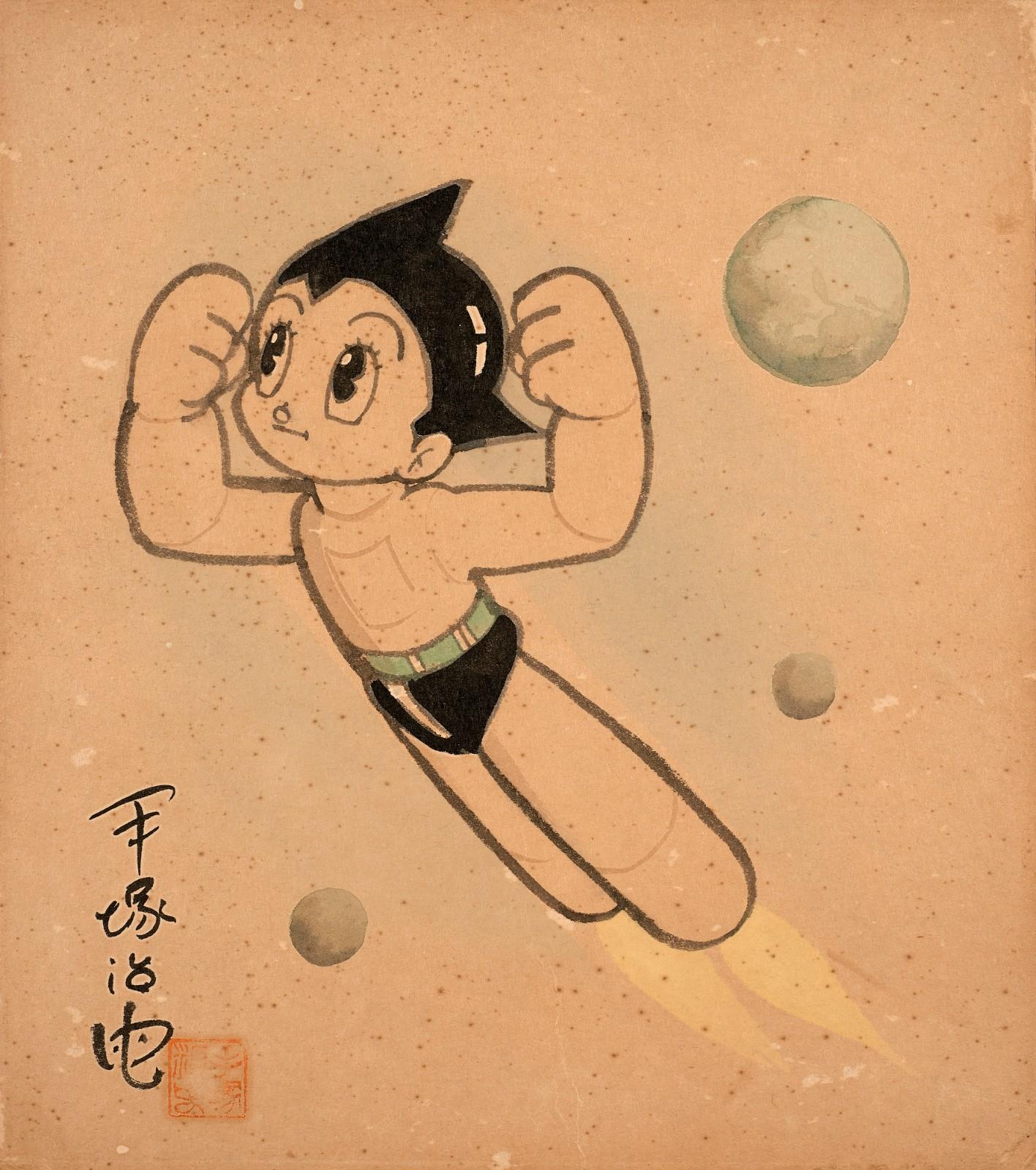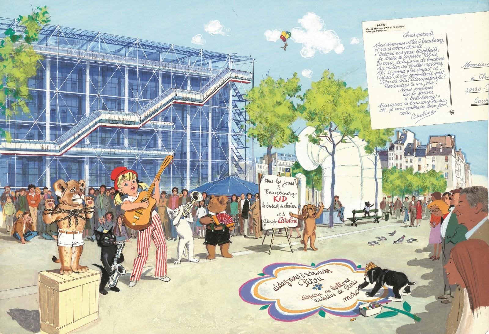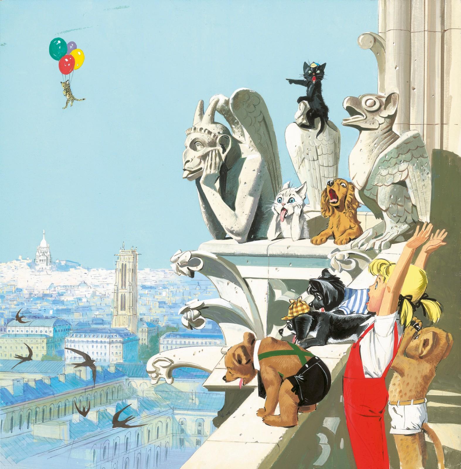 Pierre Probst (1913-2007), an artist from Mulhouse in Alsace, knew from an early age that he would become a cartoonist. With the first album from the series, Une fête chez Caroline, published in 1953, he immediately experienced a huge success, thanks to his colorful drawings illustrating the life of this little girl, joined at the hip with her talking pets. The heroine’s name was a tribute to the illustrator’s grandmother and he used his daughter, Simone, as the model who inspired her character. A beautiful panorama of Caroline adventures, which are both educational and fun, will also be presented at the auction. Twenty-two original drawings depict the adventures of the young heroine who sometimes explored the capital city–admiring the breath-taking view from the top of Notre-Dame cathedral or at the foot of the Eiffel Tower–while others recount her going back to Prehistoric times, traveling through Europe or even going on an expedition to the Moon, always accompanied by her four-legged