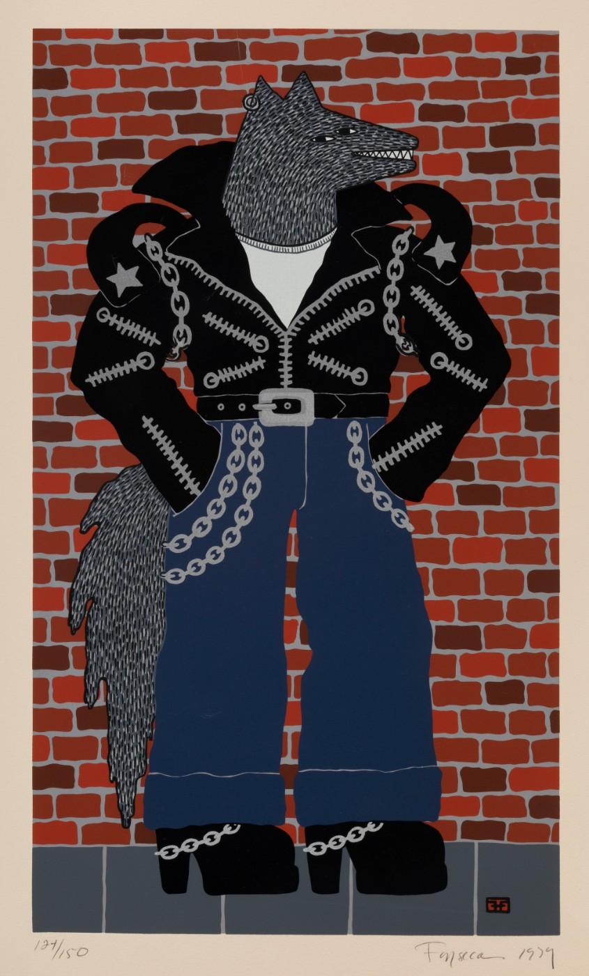 The exhibition is organized into four sections. A brief Introduction gives an overview of the artist, as does Fonseca and the Self, which speaks to the role of art in exploring both personal identity and experience. The third and major section, Coyote Leaves the Res, takes an extended look at some of the many roles that Coyote embraces, and his ability to defy boundaries and defy expectations. Via Coyote, Fonseca also explored his own artistic interests, which included modernism and European artists such as Henri Matisse. As Coyote leaves the “res,” Fonseca comments on contemporary society with a reflective, at times satirical take on the difficult histories and popular clichés against which Native people struggle. This section features the artist’s exploration of his sexuality and features Coyote Leaves the Res. (Red Wall) (1994), one of several iconic images of Coyote clad in a black leather motorcycle jacket and high-top sneakers. This section also includes Coyote as “Rose,” his female counterpart. Like Coyote, Rose is colorful and vivacious, a capable co-star in various performances including the opera and the tango.