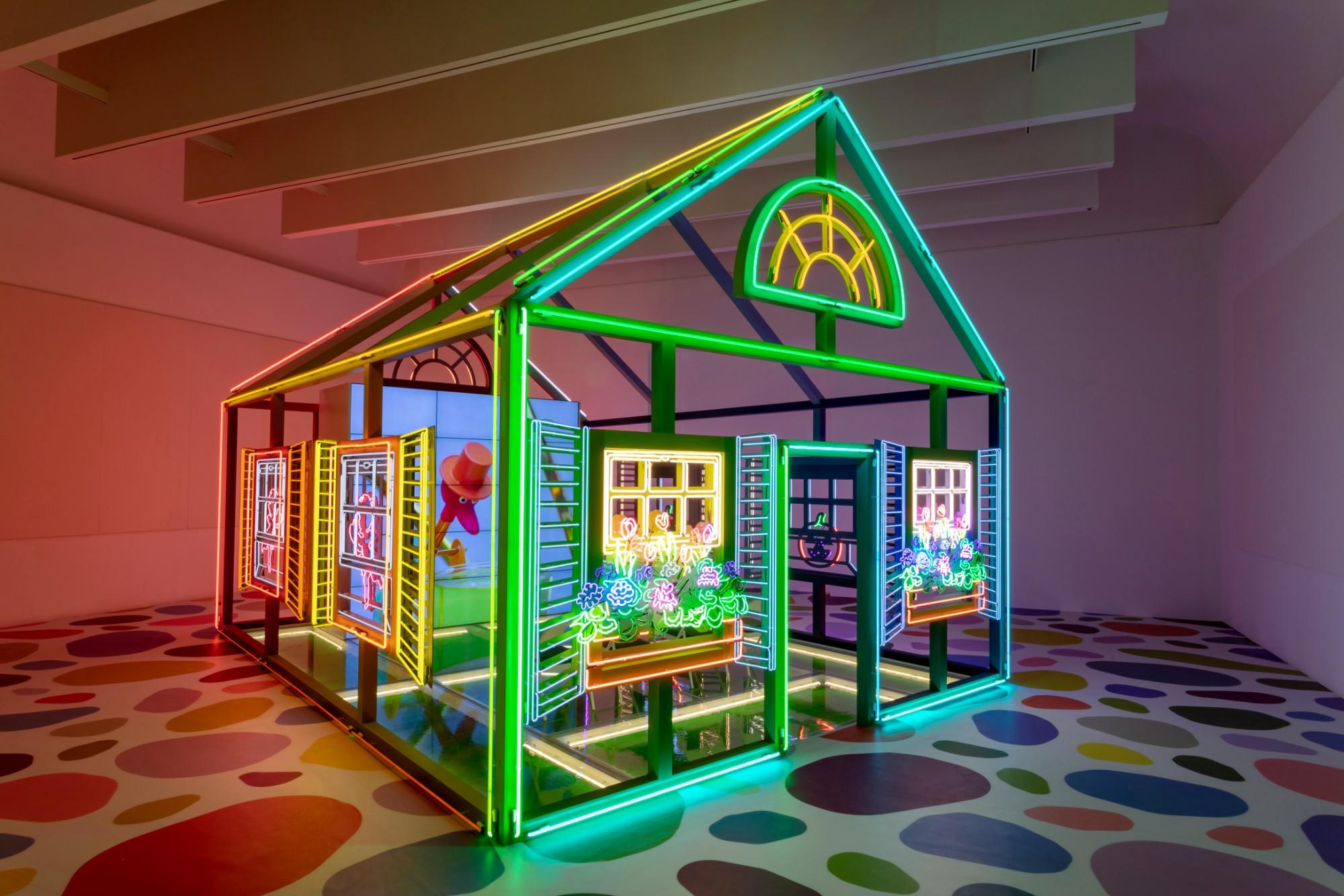 “Dialectics of Inside and Outside” explores physical, psychological, and social boundaries. Alex Da Corte’s neon house-frame installation, Rubber Pencil Devil, lures visitors in to watch a sequence of absurdist videos. Three-dimensional works by Margaret Lee, Betty Woodman, and others hover between mediums.