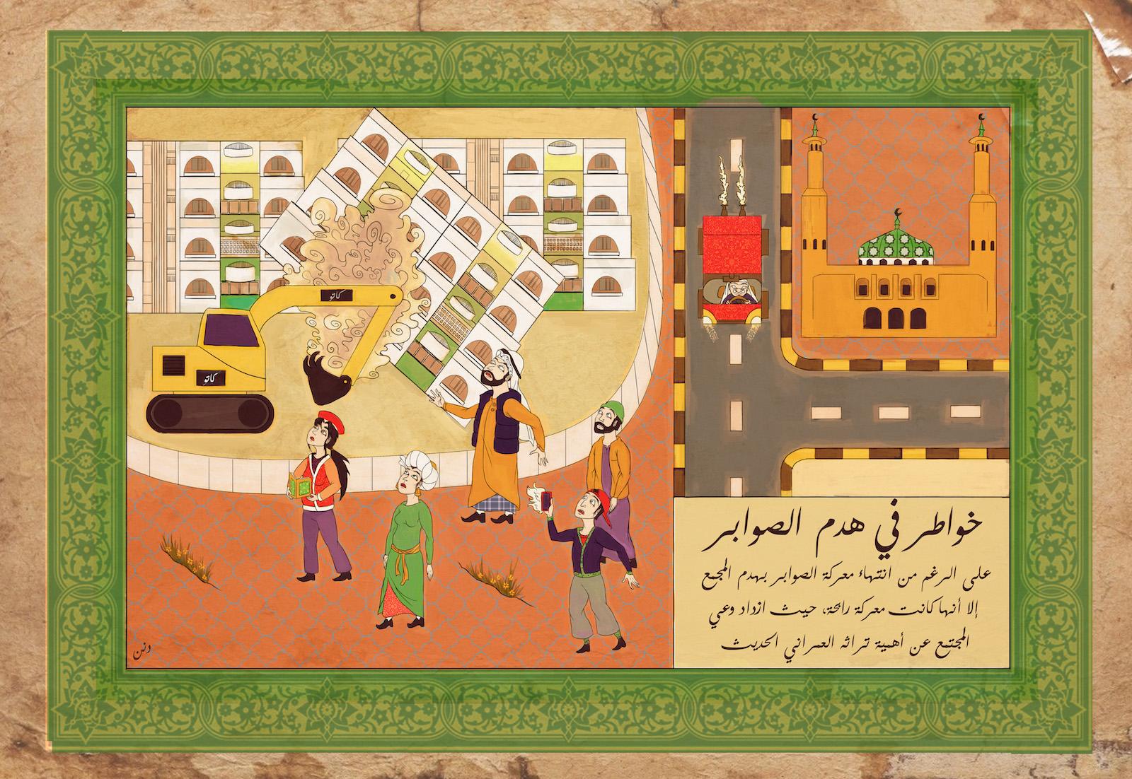 What has made Al Rashid’s work noteworthy is not only its important subject matter, but also its style, which forms a contemporary twist on the historic Islamic miniature art style “Choosing a historic style that may awaken memory and a sense of identity seemed like the logical thing to do,” Al Rashid notes when she explains why she choose this particular style of art for the works showcased in this exhibition. “But to be honest with you, the process was a lot more natural than that; I simply just ‘did it’ intuitively.” Al Rashid also incorporates characters from different eras in her digital paintings and animations, such as the those from the Saffavid Era and the Ottoman Era, to create rich dialogues that cross time and space.