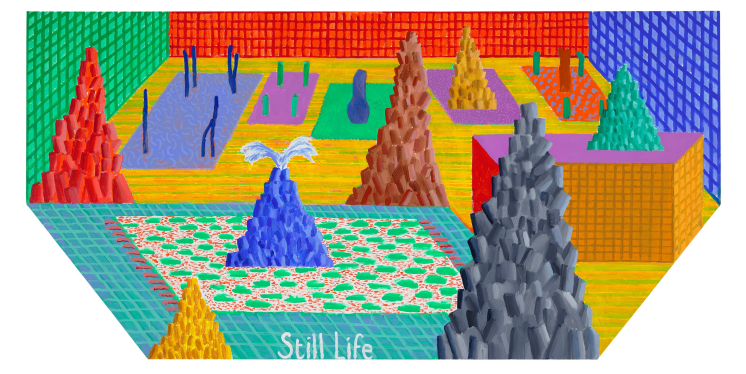David Hockney, Still Life, 2017, acrylic on canvas, 36 x 72” (hexagonal)