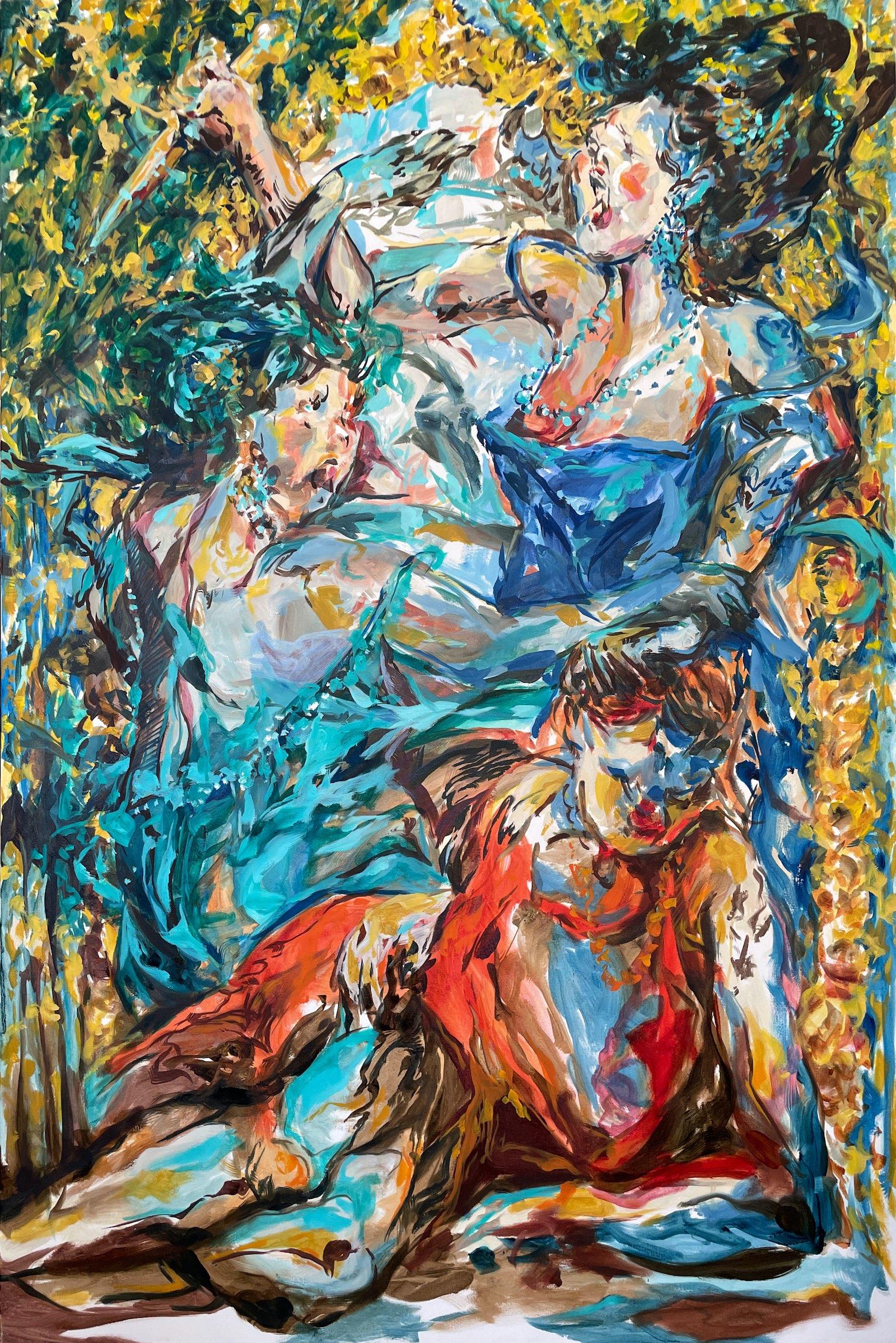 Jo focuses on interior familial scenes in a chaotic, expressionistic manner between abstraction and figuration. Her works, executed with intense physicality, pay homage to the Renaissance. Jo challenges and reimagines the ideal females depicted throughout history. She reclaims the narrative through a painterly rupture, forming and dissolving figures into a new dimension. Through a level of abstraction, the women become one with the environment, casting invisible lines out that hook you into moments you can never unsee.