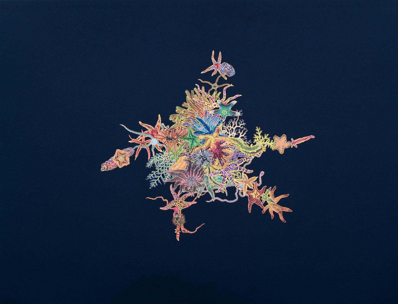 Flynn Fine Art is excited to announce its first digital presentation in partnership with Artsy, Five Quarantines, by Caroline Carlsmith. Opening simultaneously with Frieze New York and running through June 14, 2021, Five Quarantines features five exquisite drawings of forty echinoderms each. Rendered in a multitude of bright, tactile inks, each of these works was drawn over forty days spent in isolation as a meditation on how we might regenerate where we have been painfully separated from each other and parts of ourselves.