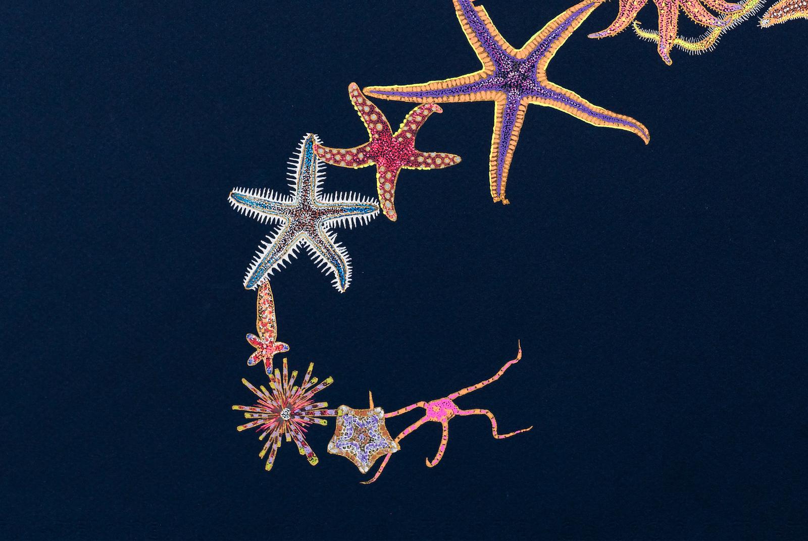 With her proximity to the havoc of COVID-19 (Queens, NY, where the artist is located, was a hotspot that spring), Carlsmith purposefully chose joyful inks in fluorescent, sparkling, metallic, opaque, and translucent bodies and laid them over a gold base on a deep blue background, a play on the motif of painted vaults depicting stars in the night sky. The artist decided to make “quarantines” of echinoderms–forty echinoderms in an echo of the historical number of days in a quarantine–as a way to mark the time. When Carlsmith began to look into echinoderms more closely, she also fell in love with the language scientists use to describe them. Because the bodies of echinoderms are so alien in comparison to vertebrates, the names are rich with complex visual metaphors. “Reading a description of an echinoderm can feel like reading a poem,” the artist relates, “Looking at them can feel that way too – the simple abundance and variety of forms is staggering, and the fact that they are living expands my sense of what that means.”