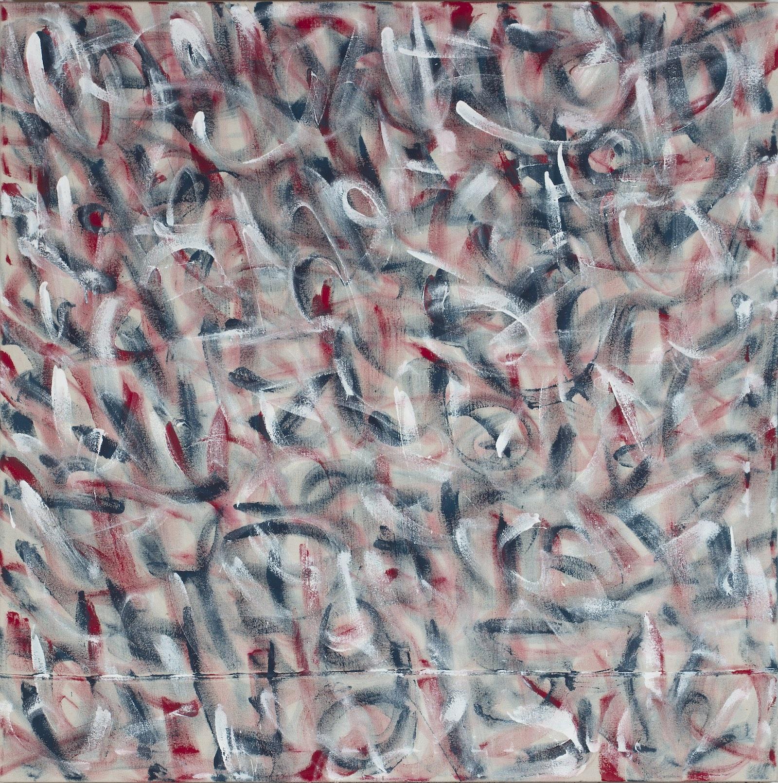 Williams’ series Battery Study examines the links between made-made and nature-made marks on urban surfaces. The series takes Battery Park at the tip of Manhattan as its inspiration: “[This park] is a point where the organic mother ocean meets the man-made metropolis,” Williams states. Envisioned as a study of this meeting rather than as a study for any final work, per se, this series is a reference to the relationship between organic weathering processes and man-made structures, specifically the marks that come about from such interactions. Williams begins each work as a calligraphic lettering exercise, then repeats a process of décollage, painting, automatic mark-making and brute force. A Laugh Which Dances (2018) is a thick, worn canvas, using a mixture of sacred calligraphy, automatic drawing and ritualized beating to elicit this meeting of the organic and inorganic.