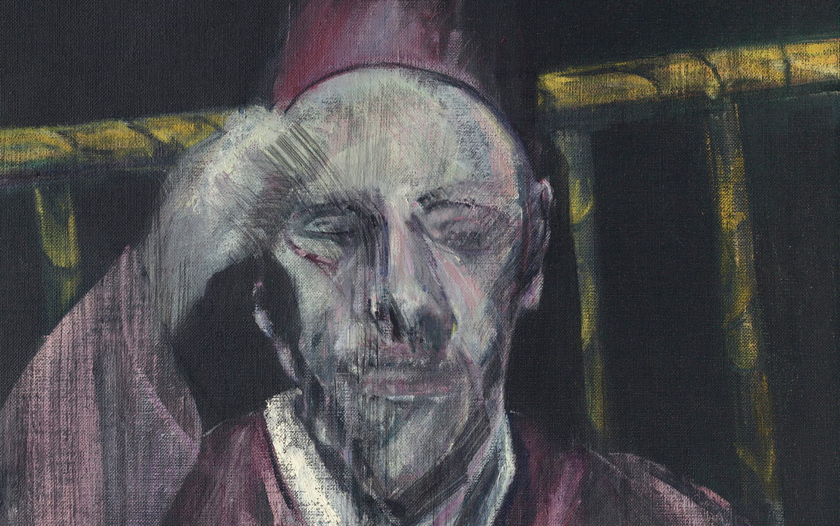 Pursued over nearly two decades, and numbering more than fifty canvases, Bacon’s Papal portraits are widely regarded as his finest achievements. These works were his first and most significant existential enquiries, and stand today among the foremost images of the twentieth century. ‘It’s true, of course, the Pope is unique’, he explained. ‘He’s put in a unique position by being the Pope, and therefore, like in certain great tragedies, he’s as though raised onto a dais on which the grandeur of this image can be displayed to the world’ (F. Bacon, quoted in D. Sylvester, The Brutality of Fact, London 1990, p. 26).