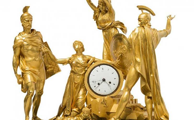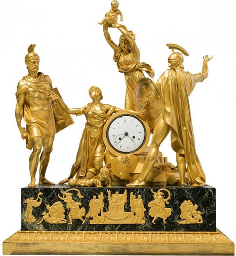 A Rare and Large Pierre-Philippe Thomire Empire Gilt Bronze and Verde Antico Marble Allegorical Mantel Clock Depicting the Intervention of the Sabine Women, circa 1810 sold for $100,000 — more than three times its high pre-auction estimate. Meanwhile, a Monumental French Gilt and Patinated Bronze Figural Clock on Marble Plinth climbed to $52,500, more than double its pre-auction estimate.