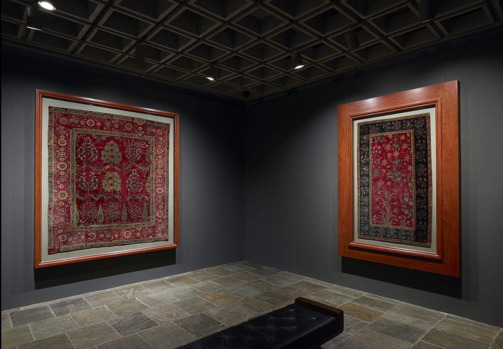 The third floor also includes a series of galleries devoted to decorative artworks, offered in dramatic displays outside of the domestic setting in which they are usually seen. Concentrated groupings of clocks and Limoges enamels offer fresh focus to two lesser-known but significant strengths of the Frick’s holdings. Another space features prized seventeenth-century Indian carpets, not shown on the floor as “furnishings,” but hung on the wall in the manner of paintings nearby (see below). Particularly arresting is a gallery displaying floor-to-ceiling porcelain organized by color, rather than by function, origin, or the date of manufacture. This blended presentation underscores how strongly influenced European firms such as Meissen and Du Paquier were by earlier and contemporary Asian wares. The confluence of East and West is further amplified by Baroque furniture. Examples by Boulle and the van Riesenburghs feature ebony, tortoiseshell, and repurposed Japanese lacquerware, materials available through emerging global trade networks. Also on the fourth floor, visitors will encounter several fine examples of important