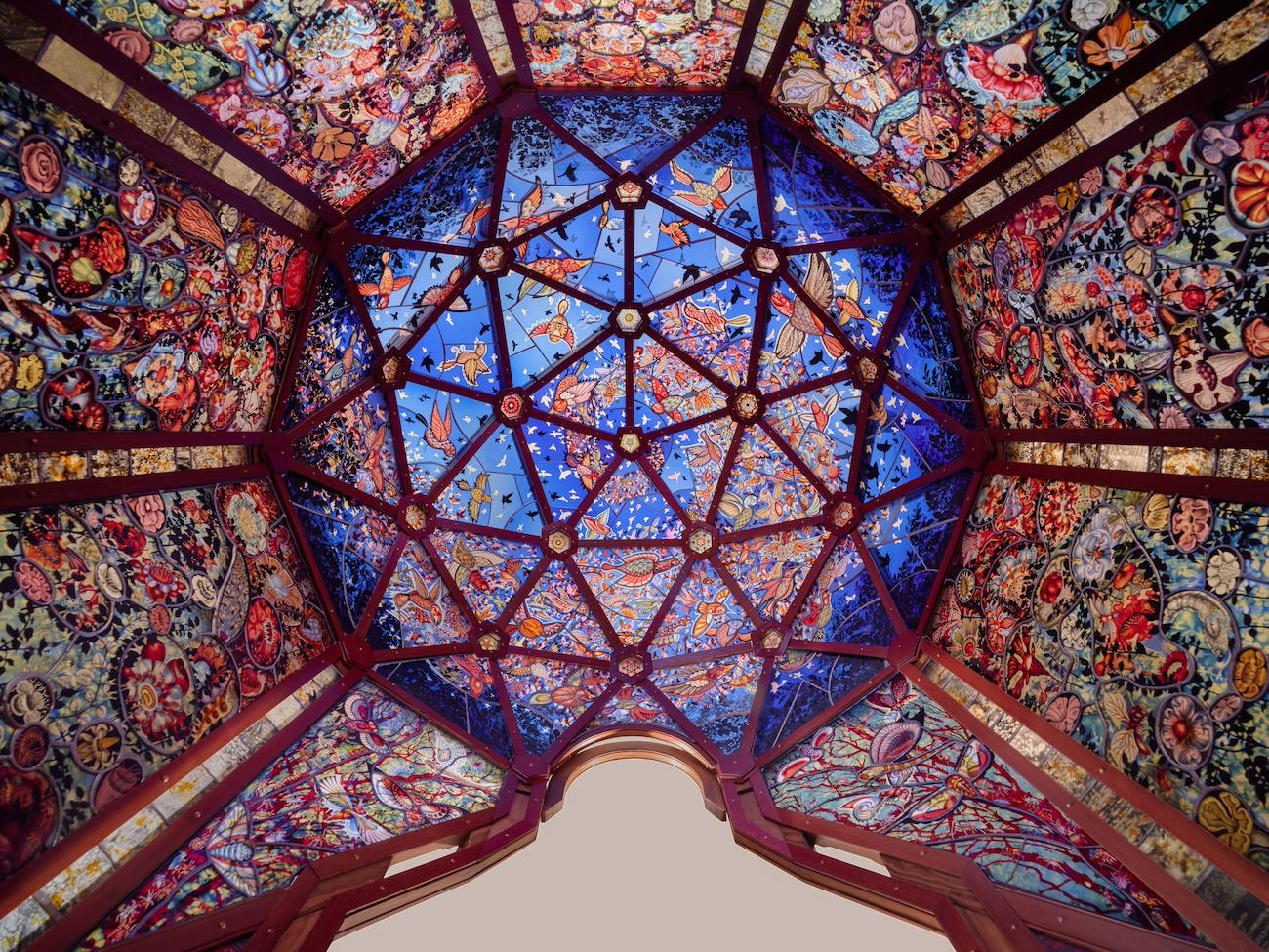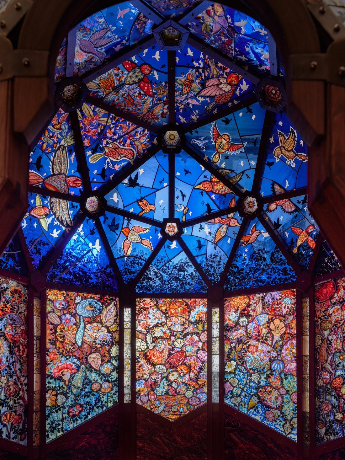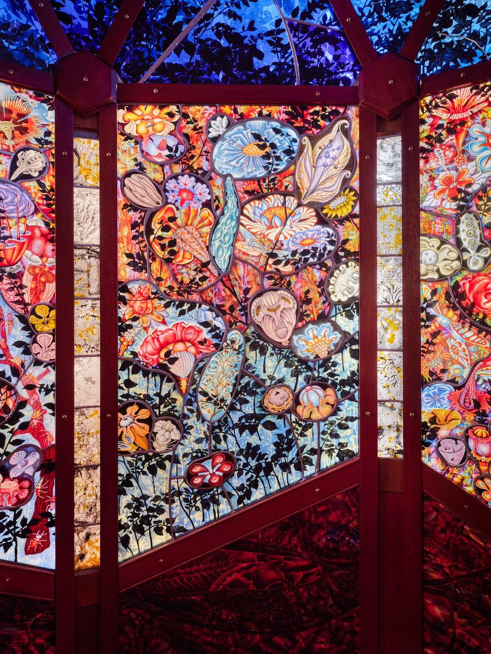 The Super/Natural dome’s 65 panels are filled with a riot of imagined insects, flora, plants, and birds, encouraging visitors to imagine themselves subsumed in the natural world, with all its beauty, violence, decay, and growth. The central stained-glass structure, reminiscent of a church, creates a sublime sanctuary space for the secular.