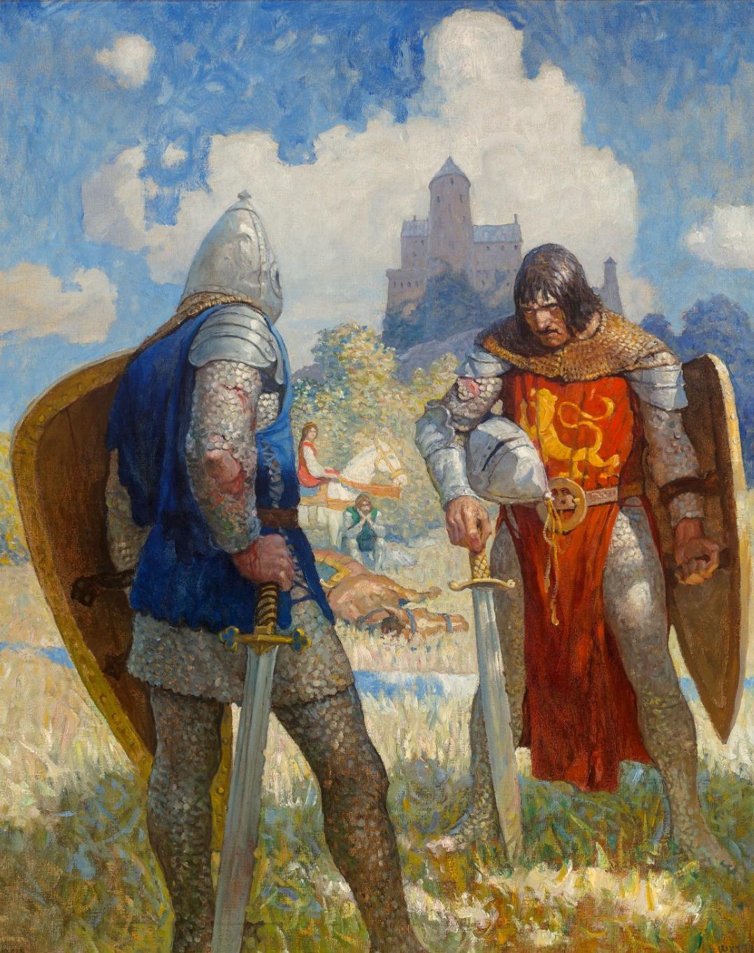 Known initially for his depictions of cowboys, pioneers and Native Americans from the Old West, Newell Convers Wyeth started imaging medieval tales of romance and adventure in the 1910s. In 1917, he executed 17 works for the latest edition of Sidney Lanier’s The Boy’s King Arthur. This version printed with Wyeth’s illustrations became an instant classic and led to numerous other commissions for the artist, including Robinson Crusoe, Last of the Mohicans, and Robin Hood.