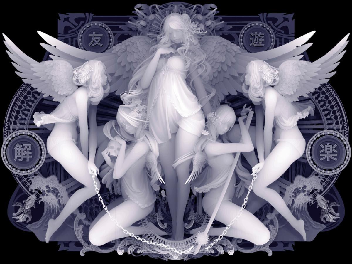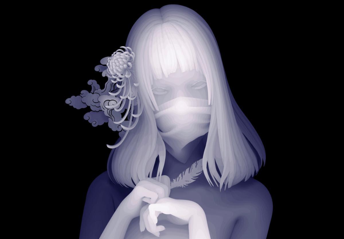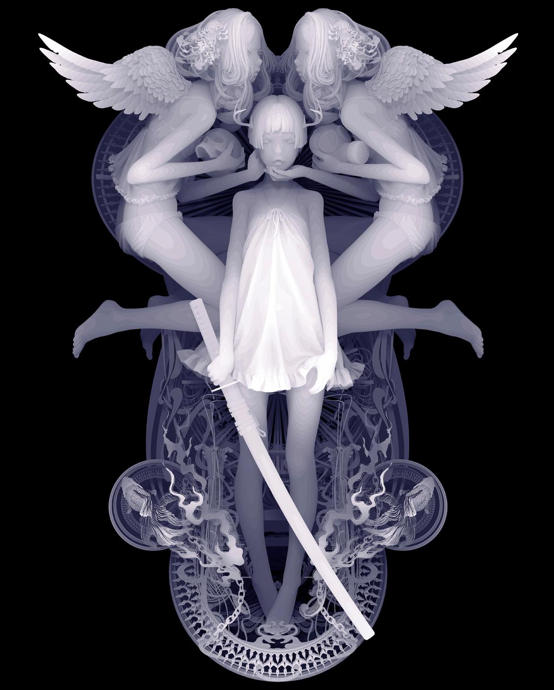 To create his beautiful pieces, Takamatsu uses a technique known as “depth-mapping” while also getting inspiration for his subjects from the classic Japanese manga girls. Depth-mapping is a mixed media technique that consists of the combination of classical drawing, airbrush, digital graphics and gouache hand painting. This process makes it so that every single pixel appears as a specific shade of grey which is proportional to the distance the viewer sees it from. Thanks to this technique Takamatsu is able to give his work an incredible amount of depth and surrealism. His monochromatic Lolitas are born in a digital study and they are then shaped through infinite shades and tones of whites and greys, to emerge from an abysmal depth into the breathtaking compositions that are Takamatsu’s final pieces.