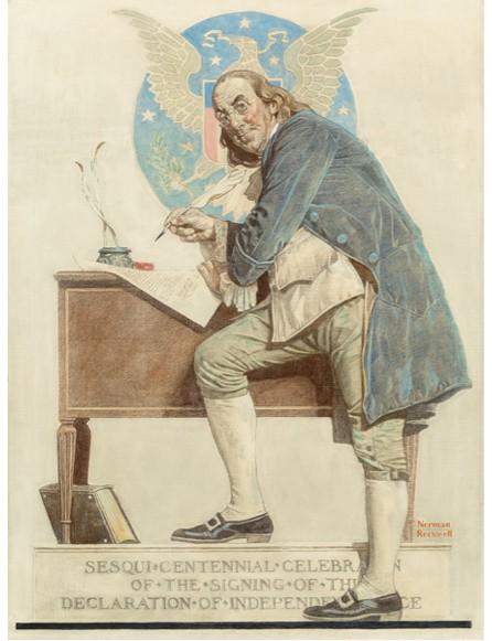 Once in the private collection of late actress Debbie Reynolds, Norman Rockwell Ben Franklin's Sesquicentennial, The Saturday Evening Post cover, May 29, 1926 (est. $800,000-1,200,000) was commissioned in celebration of the 150th anniversary of the signing of the Declaration of Independence and is Rockwell's only cover illustration featuring a Founding Father.
