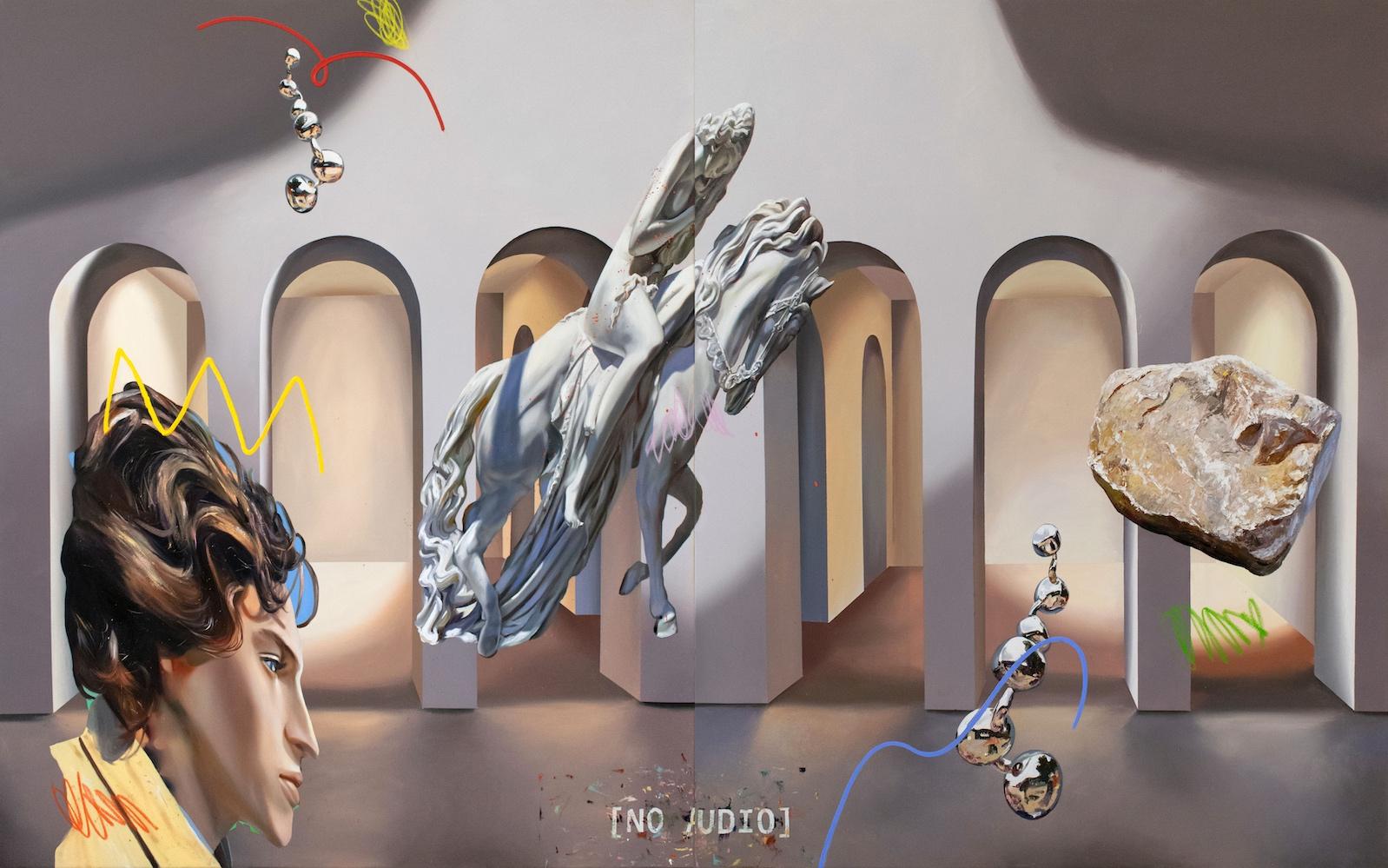 In her new collection, Loribelle explores familiar and poignant themes with an urgency that speaks to the moment, employing her signature line technique to delineate eyes, faces, and human forms entangled and abstracted into the minimalist geometric background which represents the room of the mind. She notes that "With the pandemic reducing the worlds of many to the confines of their phone screen, [the] 'room' motif seems more pertinent than ever...as a metaphor for the mind and the characters and scenes inhabiting it, signifying the external world filtered into the subconscious."