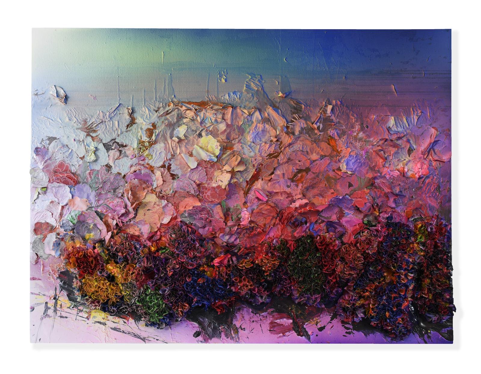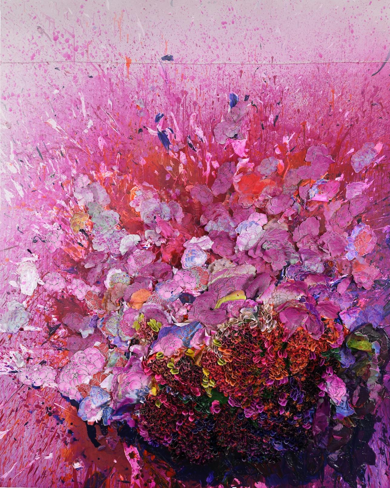 Essence is an abstract contemporary take on escapism, dwelling not on pleasurable activities but on the pleasure of an intimate and subjective encounter with the beauty and colors of nature. Its pleasure unfurls in the mind, taking viewers’ thoughts momentarily away from the strains of the present to the familiar yet uninhibited beauty of nature. The artist's distinctive teeming and vibrant 3-dimensional floral paintings have endeared him to art collectors and nature enthusiasts across the globe. His works are as pleasing to the mind as they are to the eyes, and the color-changing perspectival dynamism of his creations make them a spectacular addition to creative and living spaces.