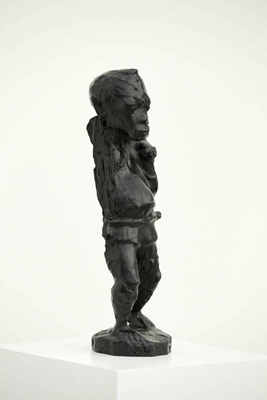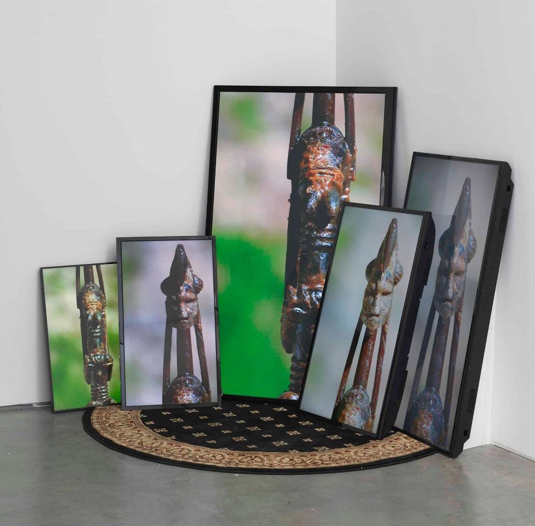 Biggers’ BAM series begins with his varied collection of wooden African sculptures. He coats each figure with a layer of wax, then takes it to a shooting range, where it is “sculpted” using various caliber firearms. The figures are then cast anew in bronze, giving them an elevated status as “power objects.” He renames each after a victim of brutality–in this exhibition sculptures are named after Sandra Bland, Michael Brown, Terence Crutcher and Jordan Edwards–imparting idiosyncrasy into the newly revitalized figures. The multi-channel video installation Infinite Tabernacle features images of the original wooden figures being riddled with bullets, as well as the playback of the ballistic sculpting in reverse and at different speeds.