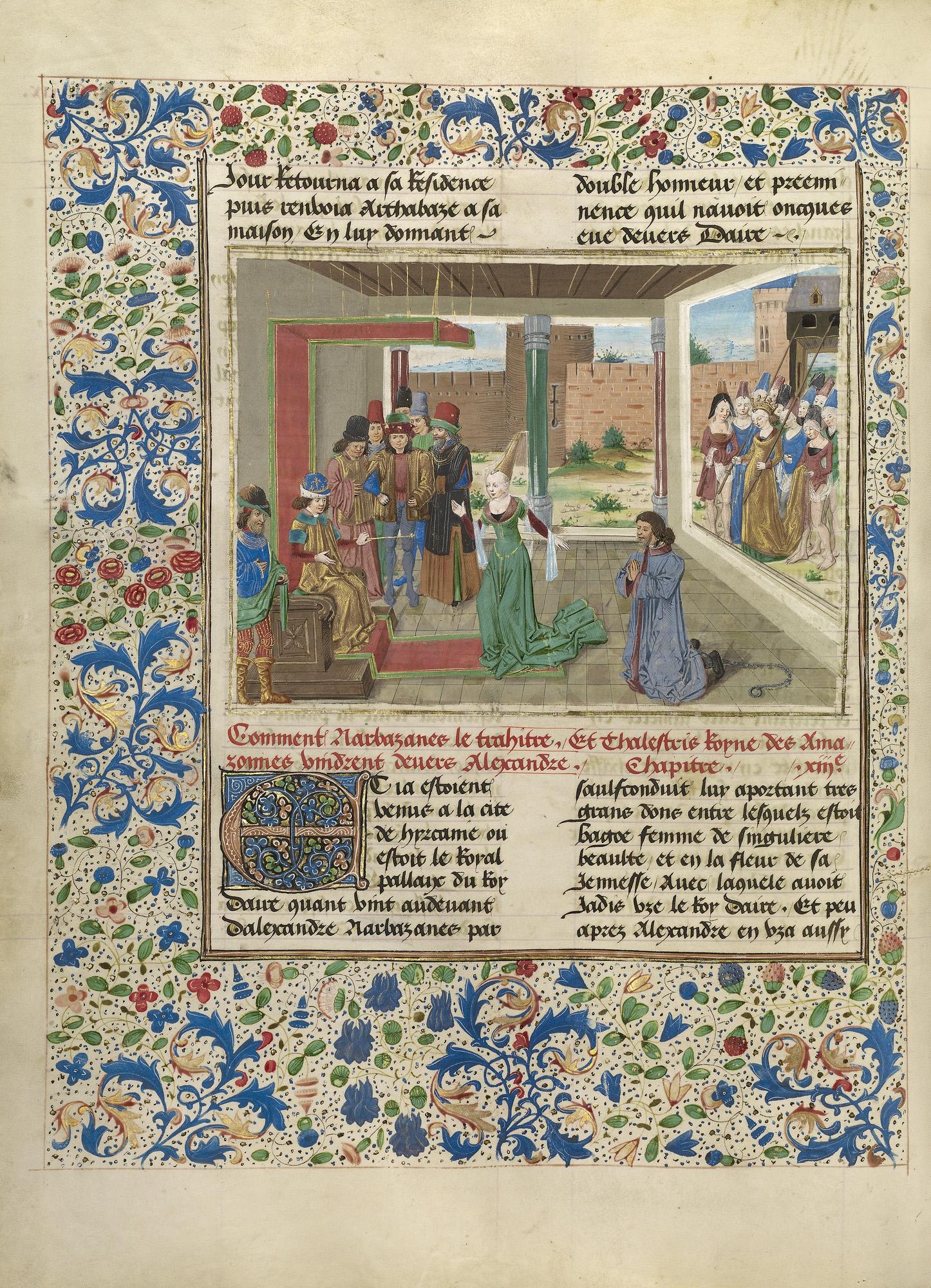 Cis-gender women and Muslims often fared no better in the medieval world. The Merovingian queen Brunhilde, a powerful heroic figure who led armies and ruled over kingdoms, fell victim to the misogyny of later medieval authors who cast her as the archetypal “nasty woman.” In Giovanni Boccaccio’s story of The Death of Brunhilde, Queen of France (1413-15) he described Brunhilde as ruthless and vengeful, characterizations that were also applied to Saracens, a pejorative medieval term for Muslims. This parallel may explain the turbaned figures in the margins of this manuscript. In medieval art, the “Saracen” became a catch-all category of people to be feared.
