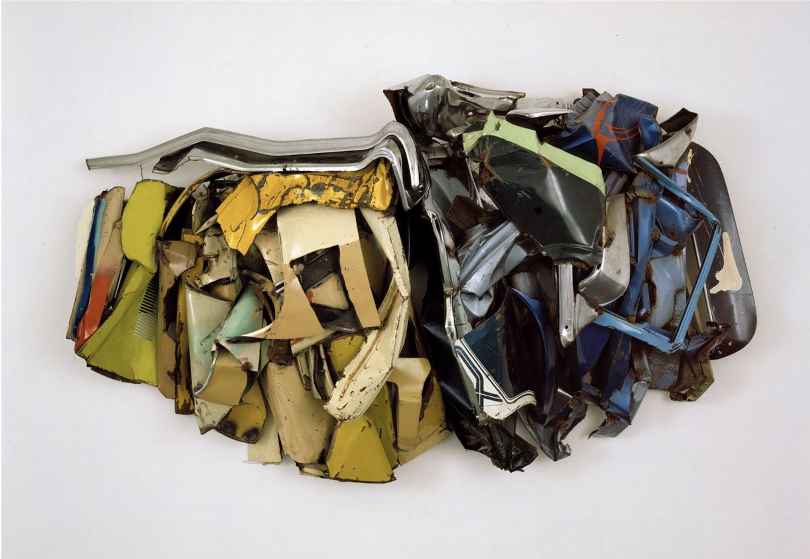 Chamberlain developed his distinctive aesthetic and techniques early in his career, citing the time he spent on an aircraft carrier as a member of the US Navy in the mid-1940s as influential on his understanding of scale and perspective. By compressing metal to generate complex folds and textures, then welding disparate elements together, he arrived at an innovative variant on three-dimensional collage that emphasizes volume and mass regardless of overall proportion. Chamberlain’s profound respect for the inherent properties of his materials is evident in the heterogeneity of his forms and the directness of his process, with the range of works on view also demonstrating the recurrence of certain physical gestures.
