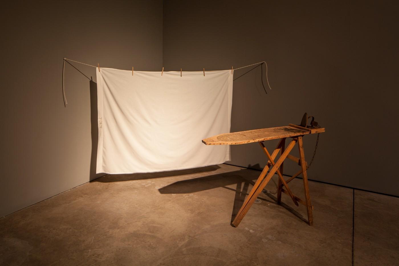 Betye Saar’s "I'll Bend But I Will Not Break" (1998) is a sculptural tableau comprising an ironing board imprinted on top with a diagram of a British slave ship, showing how scores of bodies were sandwiched into the ship’s lower deck. An iron—chained to the ironing board just as slaves were chained to slave ships—refers not only to female labor but also to the marking of slaves with branding irons. In the tableau, a sheet is pinned to an ordinary laundry line with letters “KKK” appliquéd onto the sheet, a reference to the white sheets and hoods worn by the members of the Ku Klux Klan.