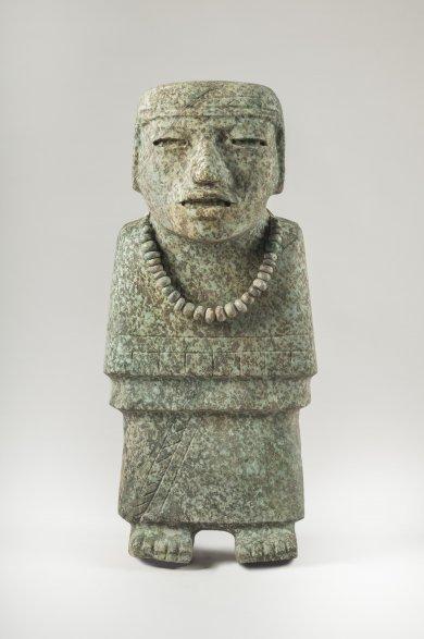 The exhibition begins with the astonishing new discoveries from 'Tlalocan,' the name given to a staggeringly rich underground offering discovered in 2003 by a Mexican archaeological team led by Sergio Gómez Chávez. The archaeologists found a tunnel underneath the Feathered Serpent Pyramid, and buried inside was an astounding collection of objects notable for their complexity and quantity. In a simulation of the cosmic underworld, the tunnel depth reaches groundwater; its walls are studded with spheres of earth covered in pyrite that gleam when light is cast on them, creating a star-filled underworld evoking the night sky. In this sacred space, the people of Teotihuacan offered rubber balls, slate and pyrite disks, feline skulls, thousands of fragments of wood and rubber, and seeds. Near the tunnel’s final chamber were four sculptures, two of which are featured in this gallery, made of precious greenstones, some apparently carrying bundles of greenstone jewels and pyrite mirrors and disks, items typically used for divination ceremonies. Placed in this significant location, they are thought to represent the ancestral founders of the city.