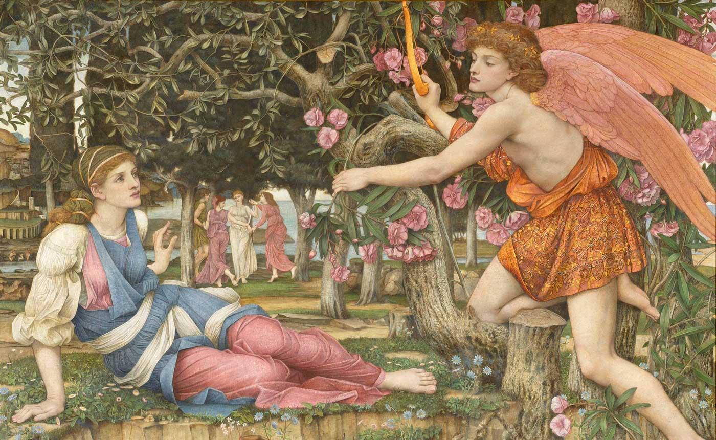 John Roddam Spencer Stanhope, Love and the Maiden, 1877. Oil, old paint and gold leaf on canvas, 54 x 79 in. (137.2 x 200.7 cm). Fine Arts Museums of San Francisco, Museum purchase, European Art Trust Fund, Grover A. Magnin Bequest Fund and Dorothy Spreckels Munn Bequest Fund, 2002.176
