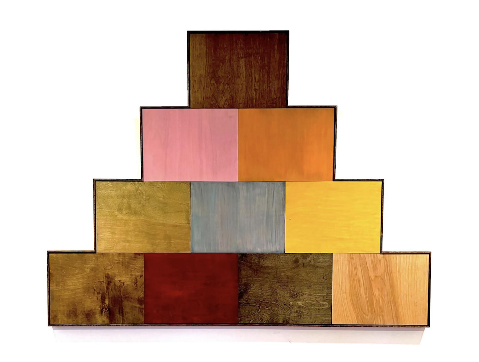 In his latest work, Michael Larry Simpson pushes out the edges of his signature rectangular color panel paintings to create larger, complex geometric shapes, resulting in more layered and dynamic works. Simpson composes his pieces with multiple color panel paintings to create relationships that move the eye within and around the work, often in harmony, at times in discord. His aim is “to evoke visceral and metaphorical possibilities” and “engage the viewer in dynamic discourse”. As a whole, the pieces in the show strike chords that seem hopeful and harmonious, yet challenge easy contemplation, as Simpson prompts viewers to look up, look around and, ultimately, look within.