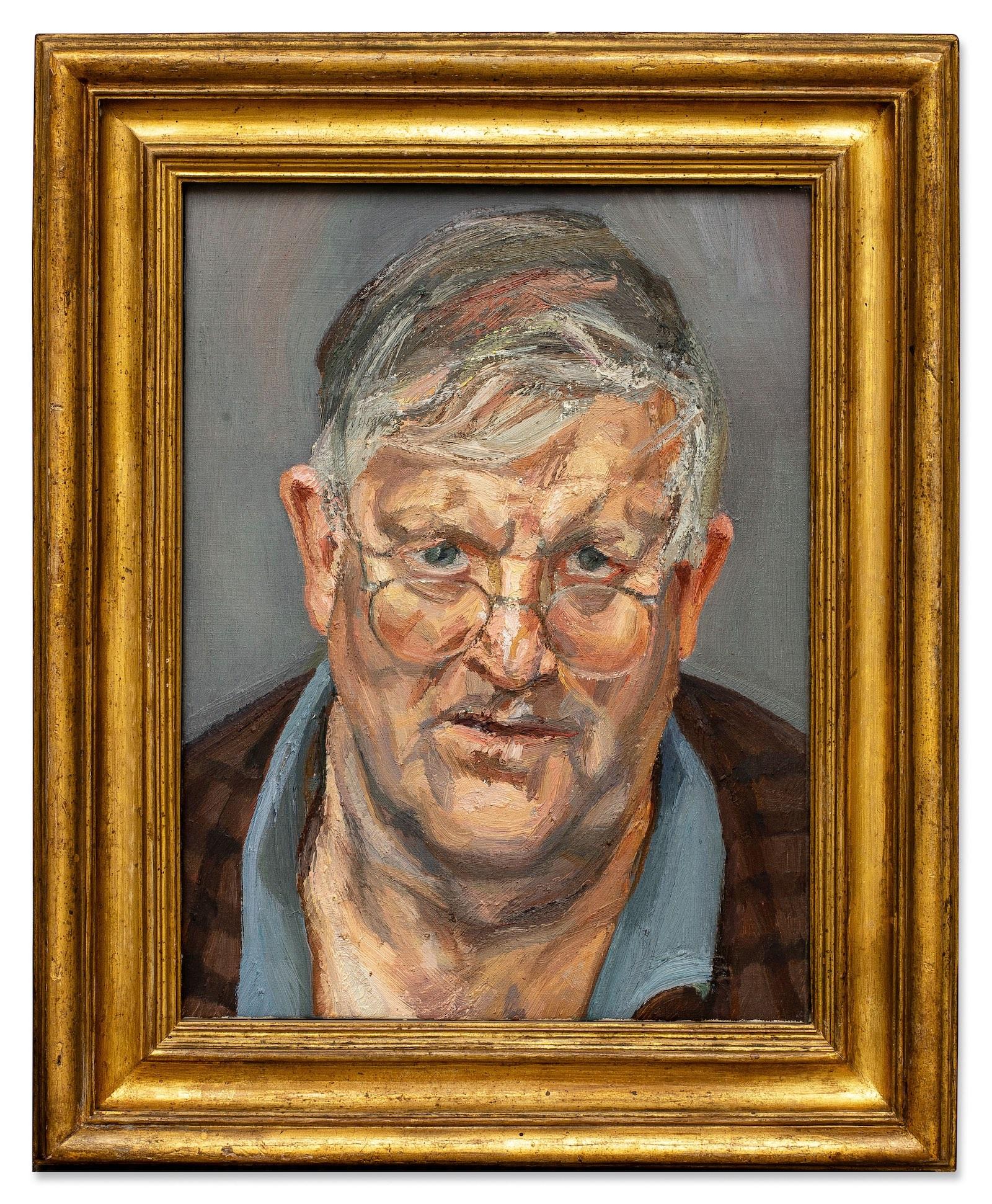 Hockney’s portrait was the latest in a series of illustrious sitters and subjects painted the year prior, from Queen Elizabeth II to Kate Moss. The portrait shows Hockney’s face close up, mid-thought, revealing his warmth and inquisitiveness as he peers over his round spectacles. Freud’s fascination with portraiture was restricted mainly to those closest to him. Whether self-portraits, or portraits of friends, lovers, criminals, members of the aristocracy, and notably, other artists, Freud only painted the significant protagonists in his everyday life. And, within the entirety of his output, only a small percentage of works were given titles identifying their subject by name. It is of no small significance that Freud’s portrait of Hockney names its sitter with such deliberate emphasis.