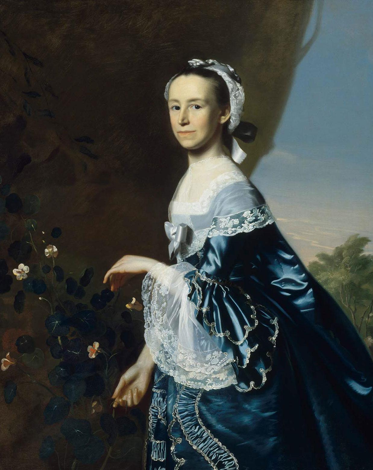 Copley depicts Mrs. Warren in her more conventional feminine role as wife and mother, demonstrating her nurturing skills by tending nasturtiums. She wears a fashionable silk dress and lace-trimmed stole that display her wealth, stylishness, and matronly modesty as well as Copley’s remarkable abilities. The finest painter in the colonies, the self-taught Copley not only brilliantly evokes the textures of skin, satin, and silver embroidery but also captures the grace and determination of this champion of women’s participation in the political life of the nation.