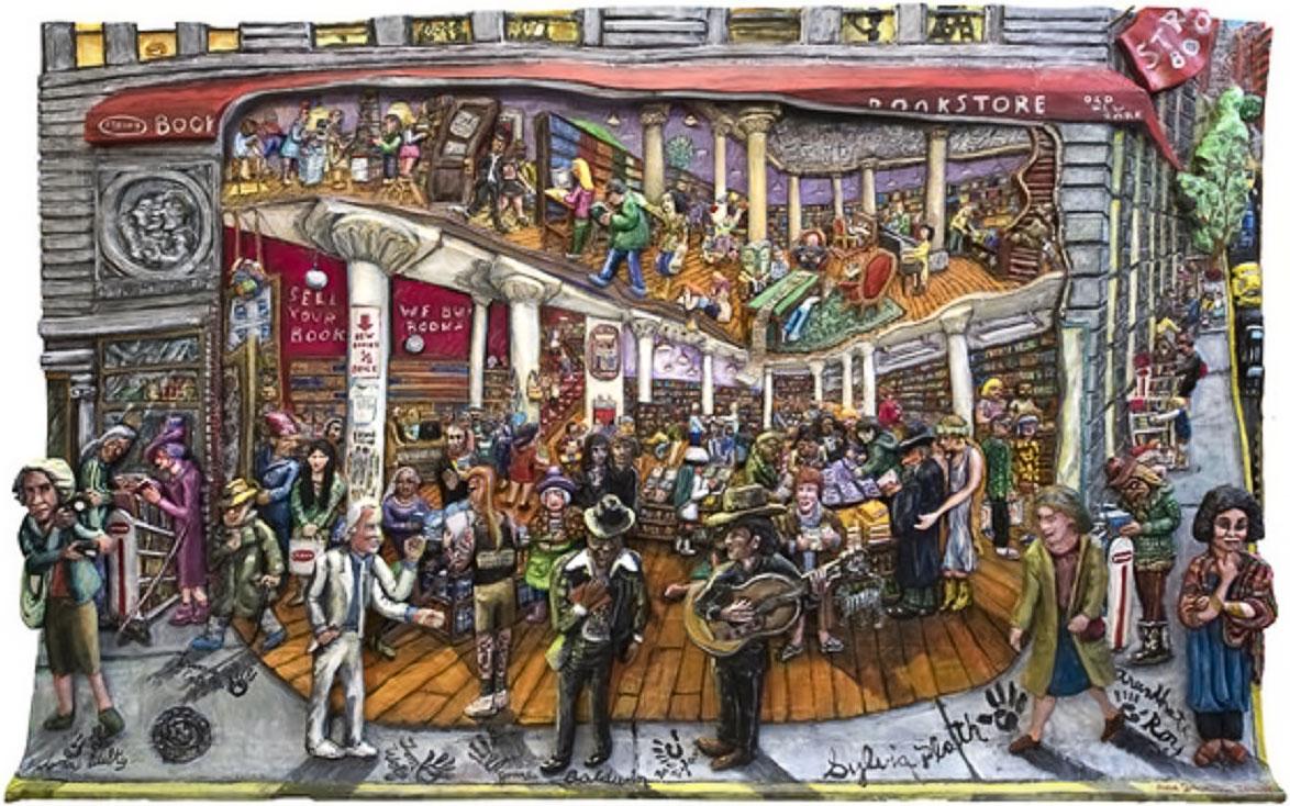 The centerpiece of the exhibition is The Strand, a nearly 10 ft. wide recreation of the famed bookstore on 12th Street and Broadway. A proud survivor of the digital age, the 86-year-old Strand is known to New Yorkers as a place for bargains and bustle. Always crowded with “18 miles of books,” and browsers from all walks of life, the bookstore is frequented by tourists and life-long New Yorkers alike. Among the recognizable characters portrayed within the work are some of Red Grooms’s heroes, among them: Philip Roth, Bob Dylan, James Baldwin, Truman Capote, Sylvia Plath, and Toni Morrison. “Sherlock Holmes,” the artist points out, is “upstairs investigating a murder.”