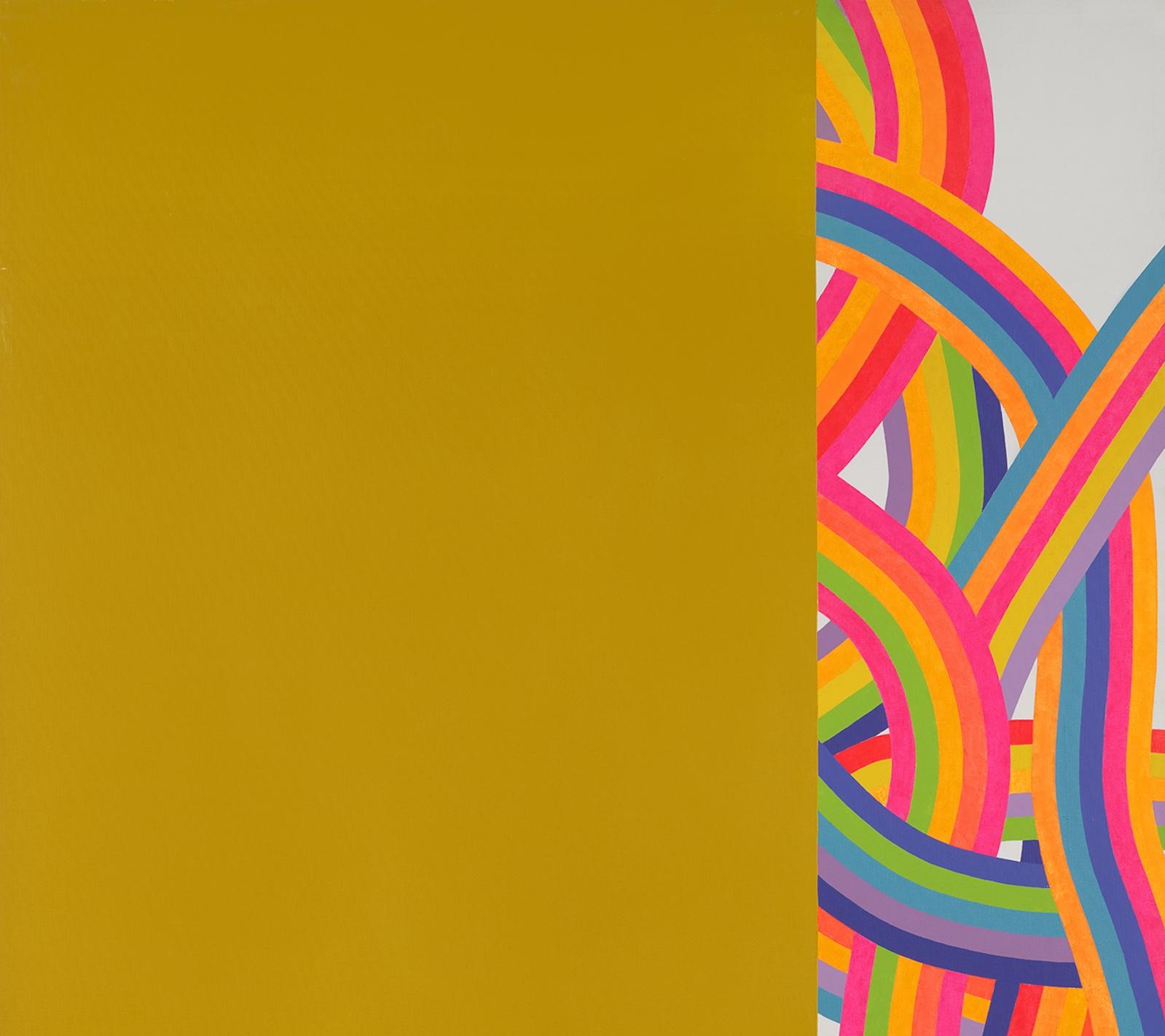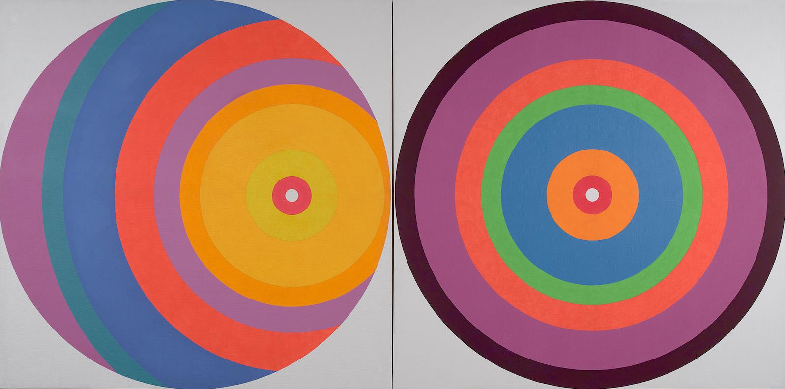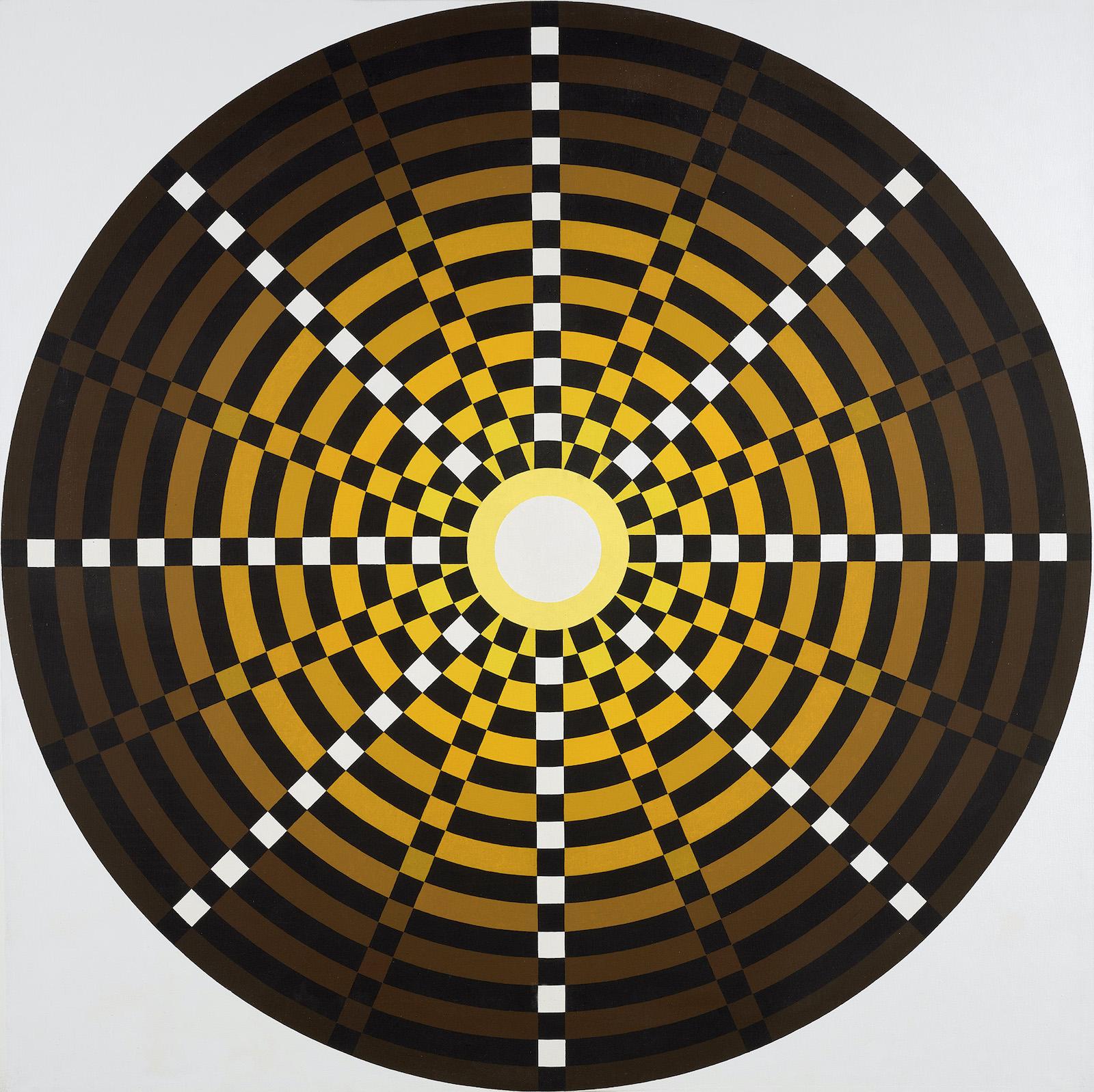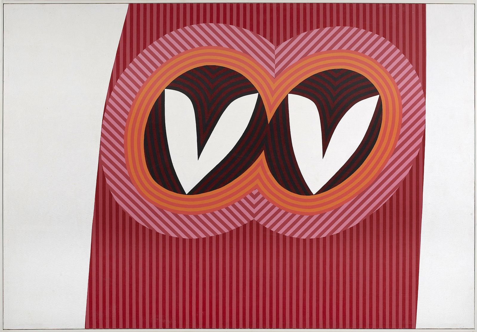 In Love Jazz (1965), two abstract hearts seem to beat together in rhythmic unison, in time with the variously striped patterns that both unite and divide them. By 1967 she was creating her On/Off series, featuring round-shaped canvases that, with a touch of humor, appear to be actual moving targets, their concentric circles projecting and receding, with some seeming to be retreating from the canvas itself. In Euphoric Concentration (1969) its daringly juxtaposed colors arrest the eye with the immediacy of Pop Art.