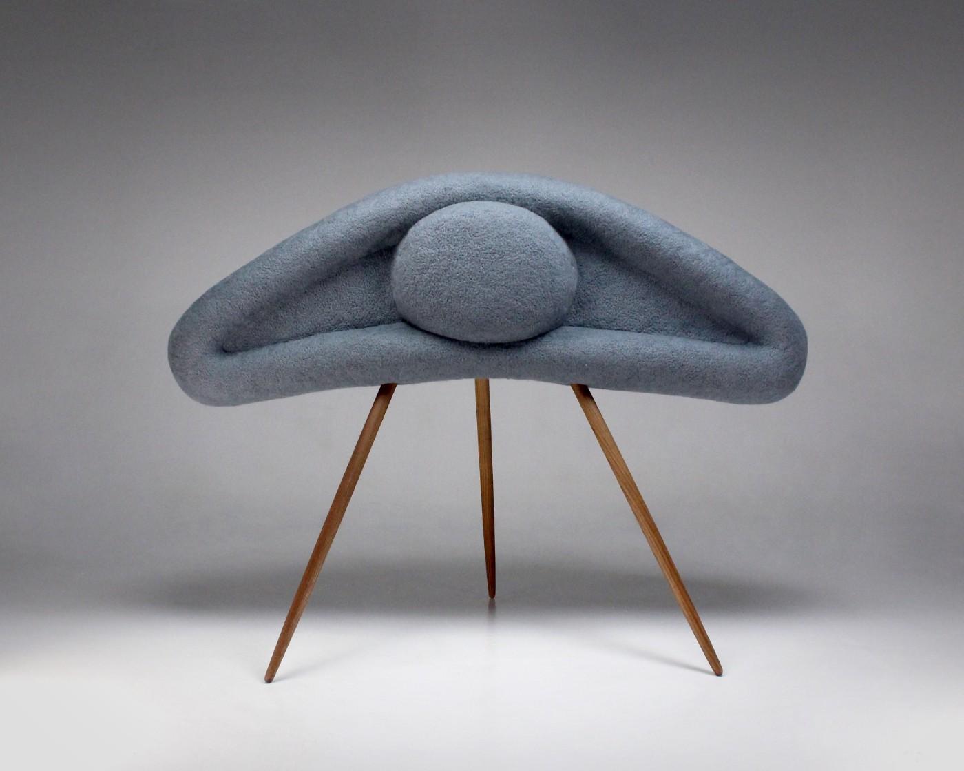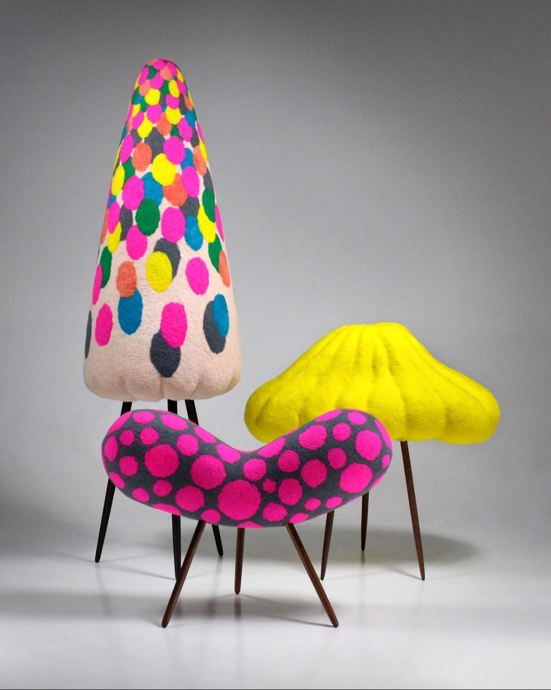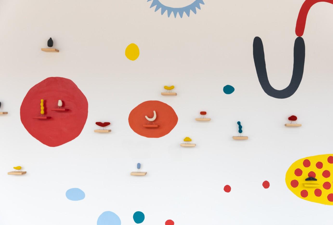 For her exhibition at BAMPFA, Miki has created more than a dozen large-scale felt-covered sculptures that appear as dreamlike shapes, subtly invoking figurative objects such as lips, umbrellas, and insects. These works draw on the artist’s interest in Shinto, Buddhist, and traditional Japanese culture, such as the belief in shape-shifting spirits (yōkai), which Miki references in the titles of works like Kinoko (Mushroom Ghost) and Nyoijizai (Animated Back-Scratcher). Brightly colored and gently playful, the sculptures are displayed at BAMPFA in an immersive installation that also includes abstract images on the floor and walls of the exhibition gallery. The interplay of shapes creates a sense of fluidity between two and three dimensions, alluding to the intersection of corporeal and spiritual worlds that is a recurrent theme of Japanese folklore and of Miki’s own practice.