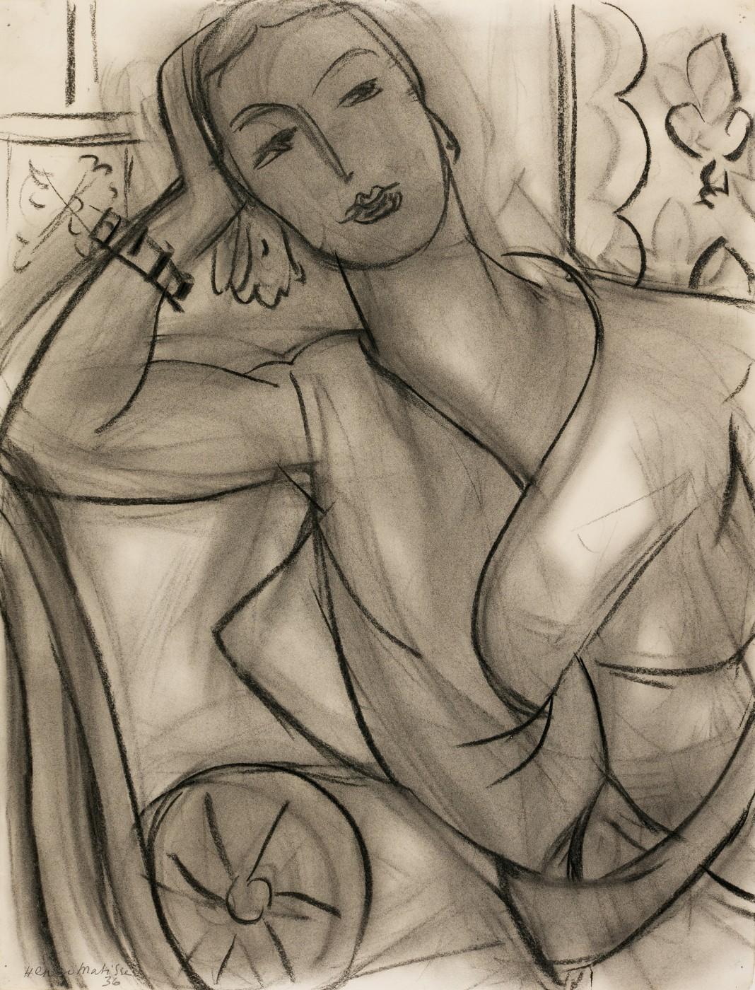 One of only a handful of commissioned portrait drawings Matisse made of English women, the sitting was arranged by the artist’s son-in-law Georges Duthuit, who was a writer and friend of Vanessa and Duncan. The sitting resulted in two portraits of Mary, one of which he kept in his personal collection and the more elaborate of the two [the present work] was bought by the sitter. With charcoal lines enriched with the estompe technique, Matisse masterfully evokes the character of the model as well as the atmosphere and light. Following her experience, Mary wrote that “in spite of all people say I think he is delightful” and on the occasion of Matisse’s final visit to London in 1937, she gave a lunch party for the artist. Mary saw him one last time in 1948, when she and Clive visited his home La Rêve, Vence, in the south of France.