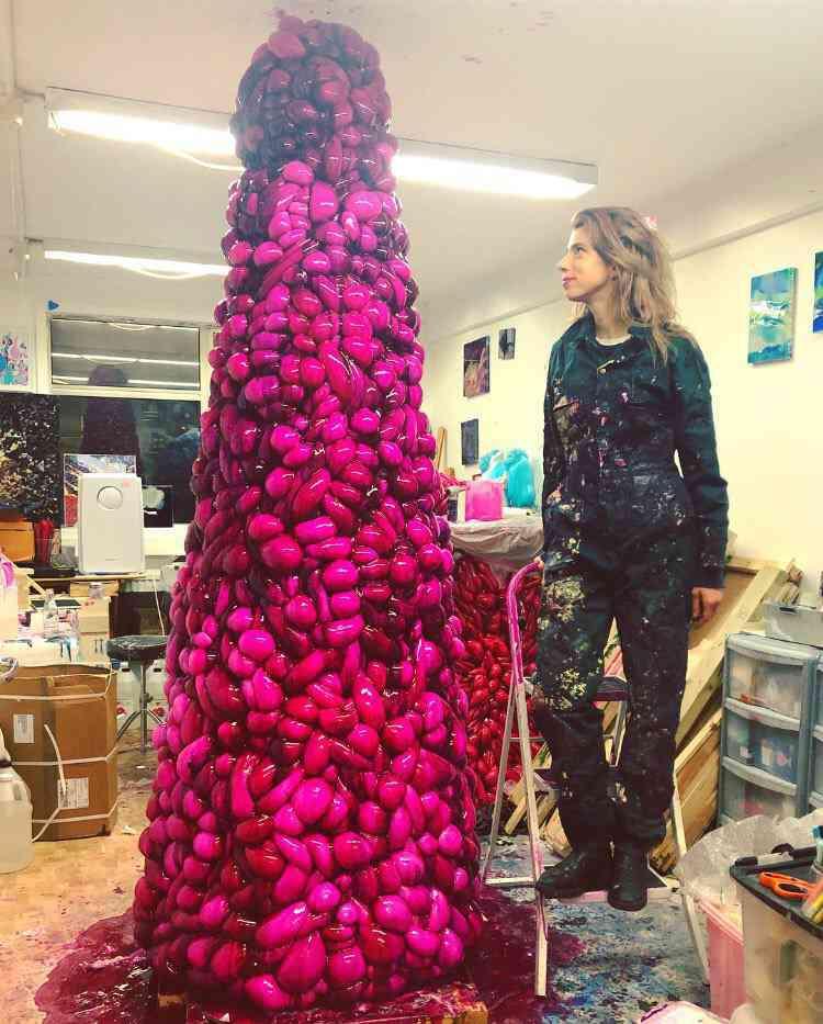 Winner of the Saatchi Young Artist Prize in 2018, Miranda Pissarides creates work fixated on dualities and the spaces in between them. She works in both the fields of painting and sculpture, with each practice informing the other--her paintings have the depth and weight of sculpture, while her sculptures have the ethereal and fluid qualities of painting. In the large-scale sculpture, entitled Violet, Pissarides used raw pigments to convey the conflicting feelings of desire and repulsion. The use of resin blended into this monumental stalagmite creates an effect of liminality, a substance that seems to exist between the states of solid and liquid.
