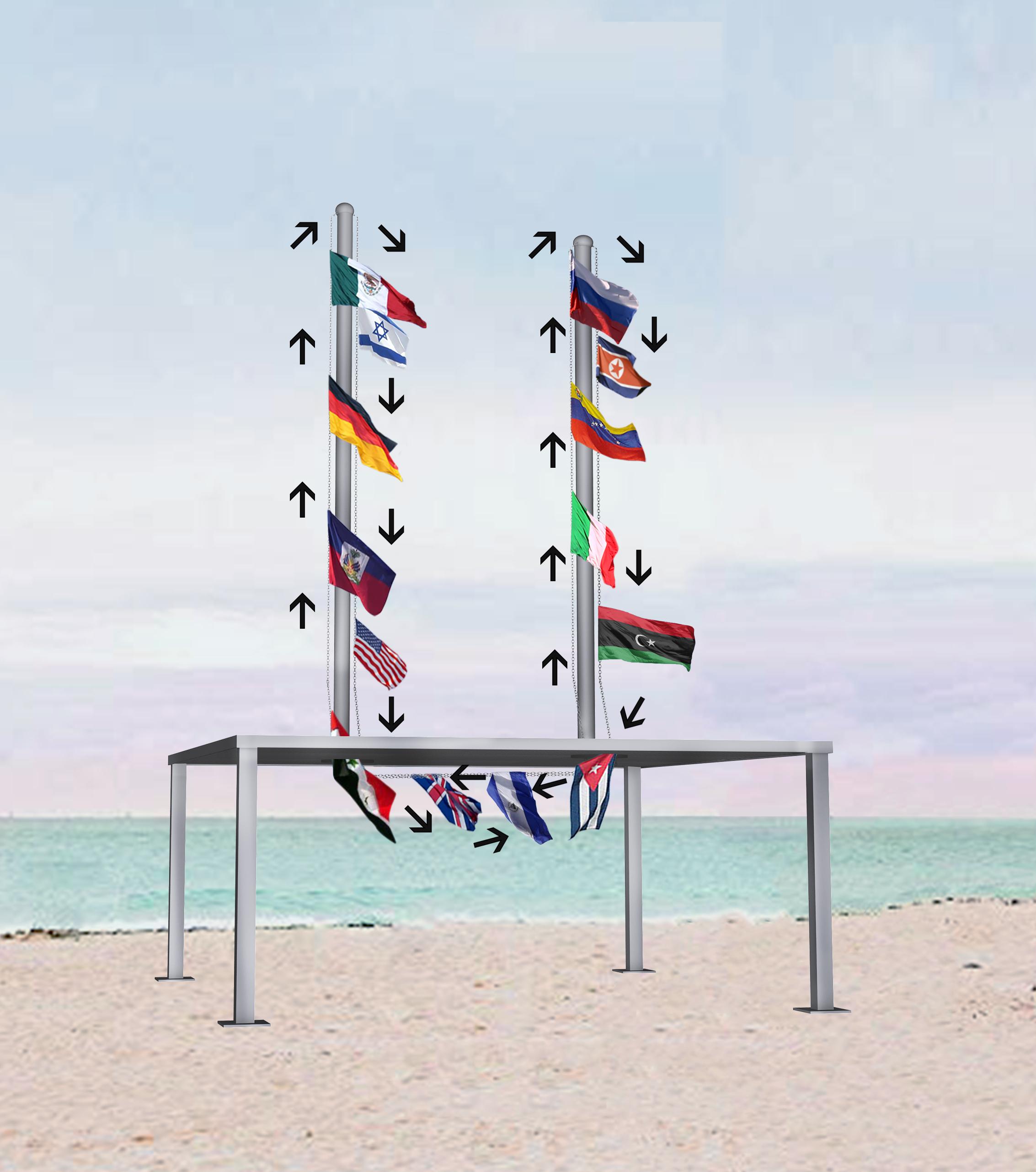 The flagpoles are transformed into kinetic sculptures to explore the intersection between performance and sculpture. Physically embodying the mechanics of power dynamics, the sculpture animates the flags to offer a participatory and contemplative place that highlights the role of the body in space. Located on the sand during one of the largest art fairs in the world, the flags demarcate a transnational non-space. Now more than ever, this piece speaks critically to the rising popularity of nationalism, crushing neocolonialism, the devastating population without a home seeking asylum, and the displacement of people due to issues including the global climate crisis and regional wars. The artists have chosen a sample of flags that stand in for the multitude of countries facing these same issues worldwide.