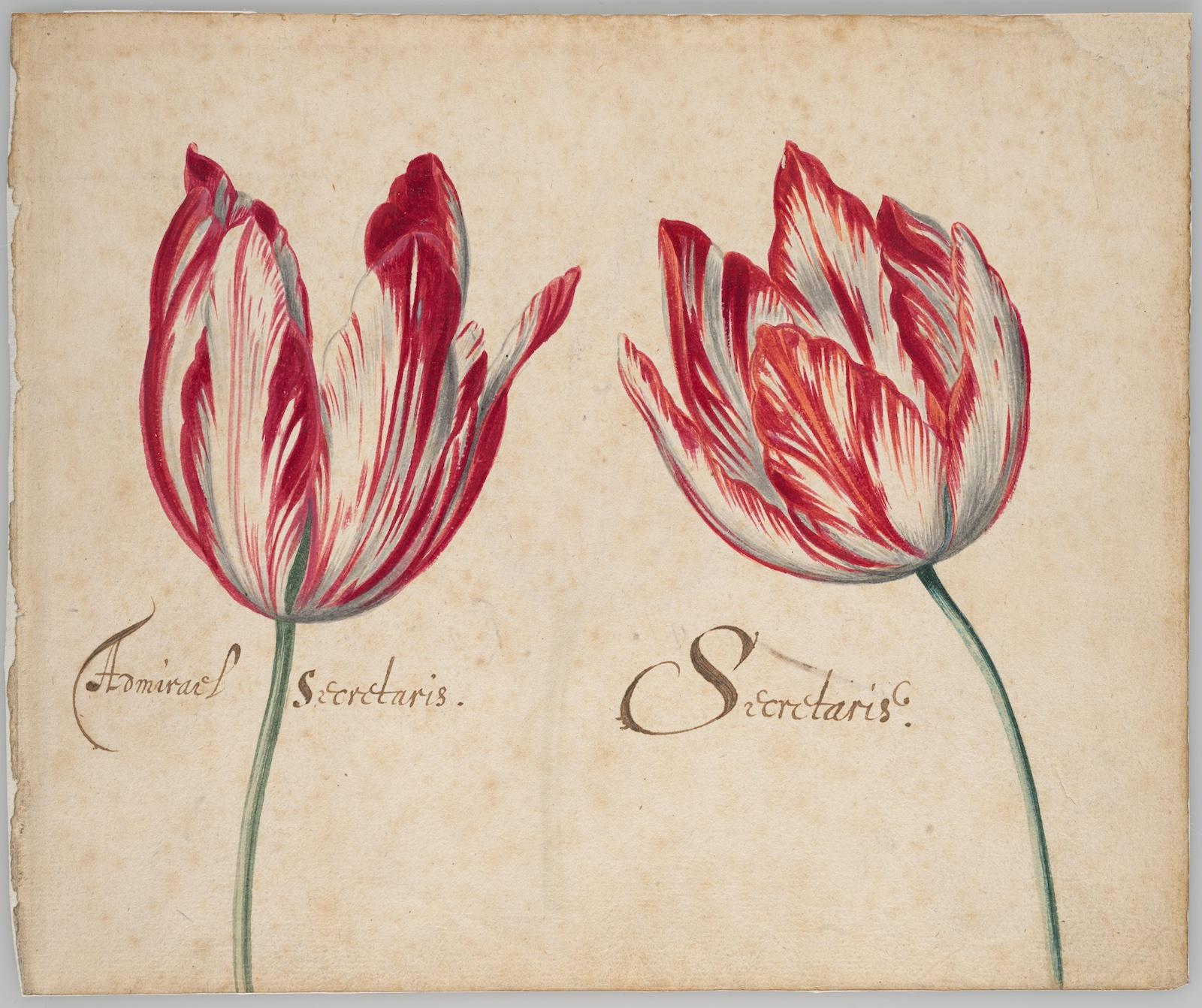 Unknown Dutch artist, Two tulips (recto) and One Tulip (verso), ca 1633-37 (recto shown). Watercolor and wash (drawing) and ink (inscriptions) on laid paper, 17.8 x 21.6 cm (7 x 8 ½ in.).