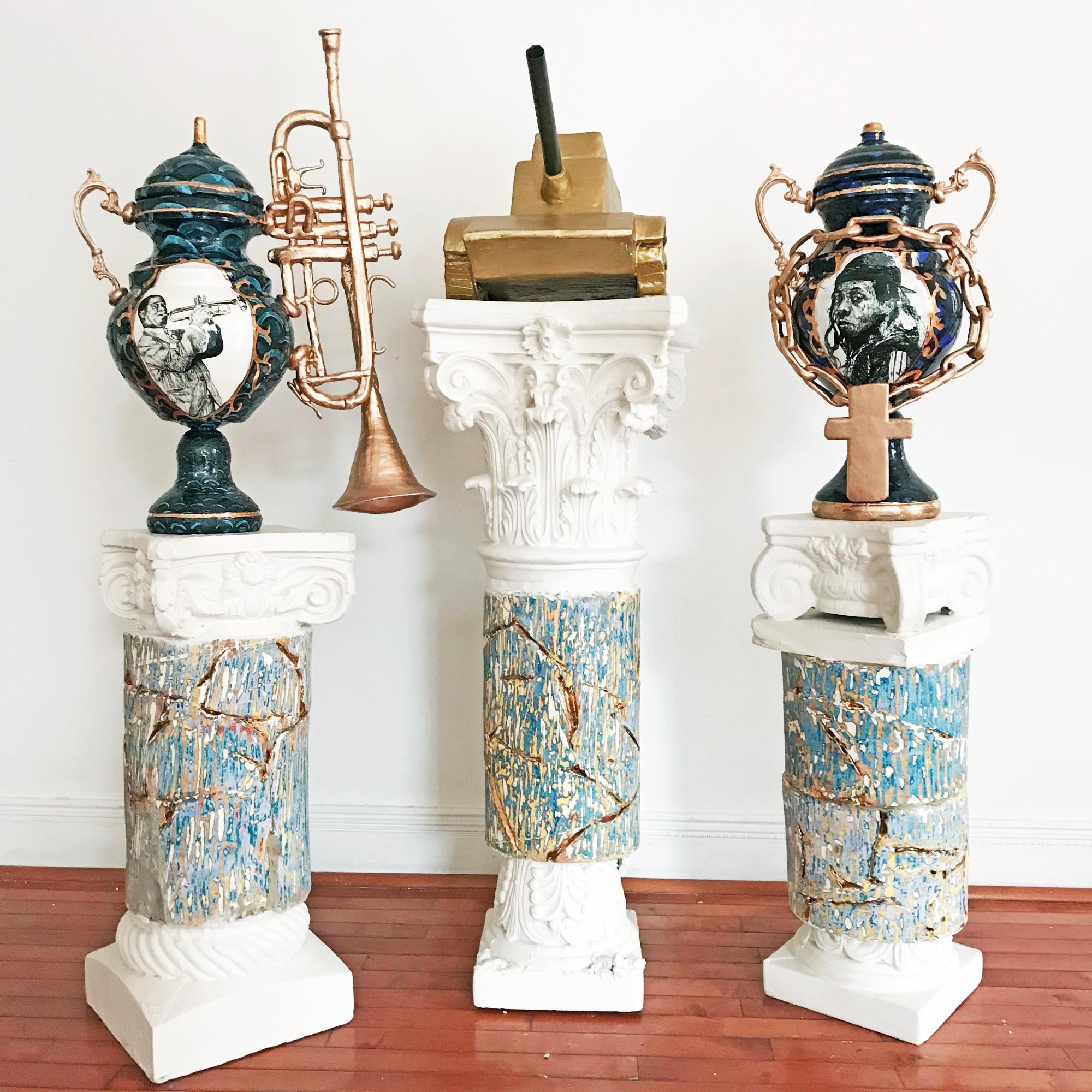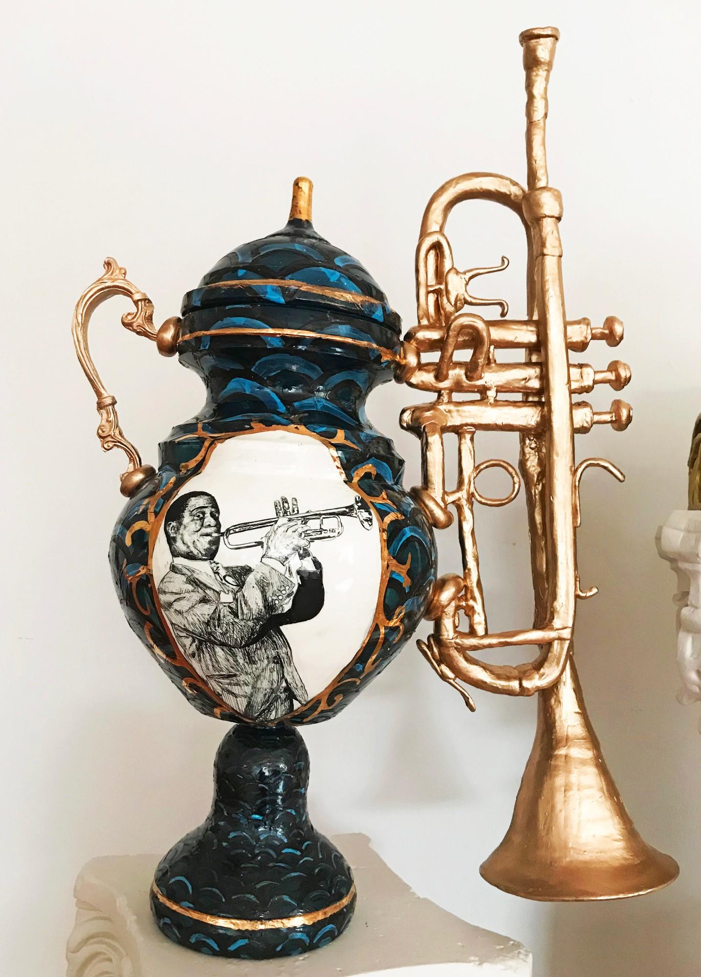 “My ‘Stunting’ Garniture Set references influential members of the Black New Orleans community in American society, highlighting the visual connection between hip-hop ‘bling’ and Sèvres porcelain in NOMA’s collection,” says Lugo. “Lil Wayne is considered the most influential hip-hop artist of the last decade. His public image is heavily embellished with measuring success by excessive wealth and glorifying gang violence. The gold tank represents No Limit Soldiers, the 1990s hip-hop artists responsible for coining the sound of ‘southern rap.’ In contrast, jazz legend Louis Armstrong is beloved by a much broader audience. By placing these figures together, I am able to examine more closely how to bring the hip-hop community to the forefront.”