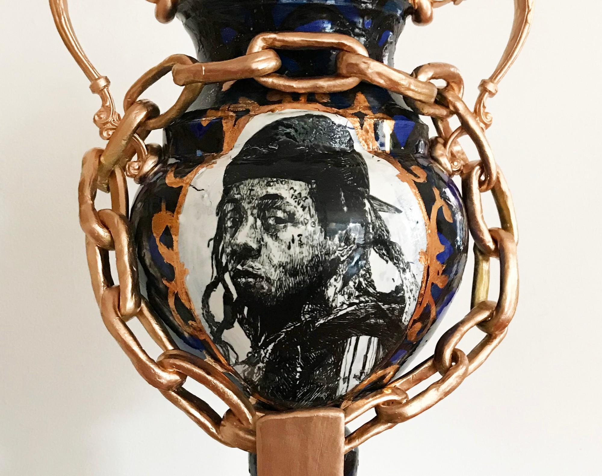 Roberto Lugo is an American artist, ceramicist, social activist, spoken-word poet, and educator. Lugo uses porcelain, a traditionally precious material, as his medium of choice, illuminating its aristocratic surface with a twenty-first-century street sensibility. He paints traditional Asian and European porcelain forms by hand with classic decorative patterns laced with elements of urban graffiti. Lugo’s pots highlight portraits of individuals whose faces are historically absent on this type of luxury item—people like Sojourner Truth, Dr. Cornel West, The Notorious BIG, and very often the artist himself.