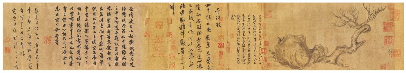 The painting is part of an extended scroll which is complemented with calligraphy by Mi Fu – a renowned painter and calligrapher and a contemporary of Su Shi. Both Su Shi and Mi Fu are amongst the four most celebrated calligraphy masters of the Song period.