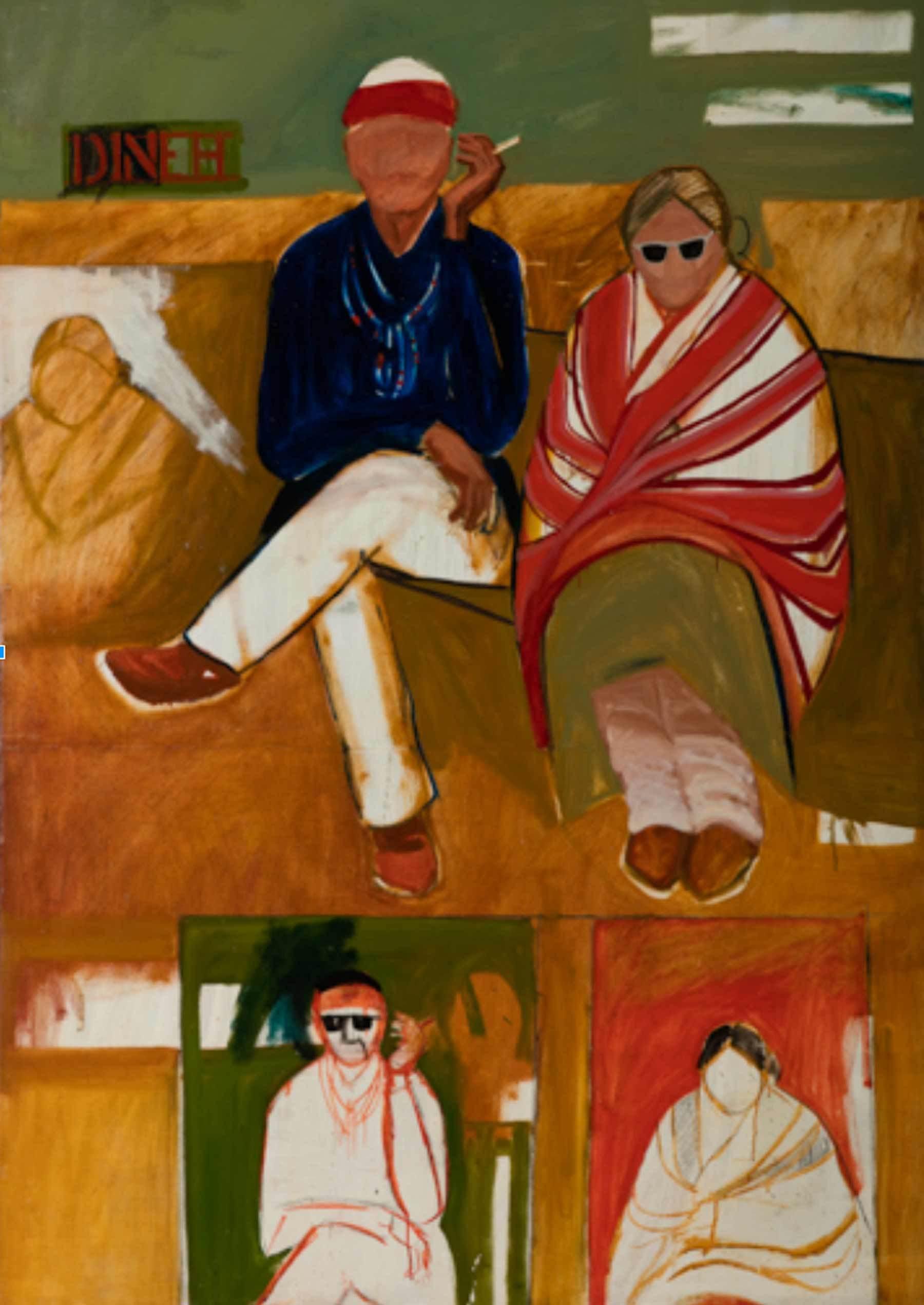 T. C. Cannon (1946–1978, Caddo/Kiowa), Mama and Papa Have the Going Home Shiprock Blues, 1966. Acrylic and oil on canvas. Museum of Contemporary Native Arts, Santa Fe, New Mexico, Honors Collection CD-10.