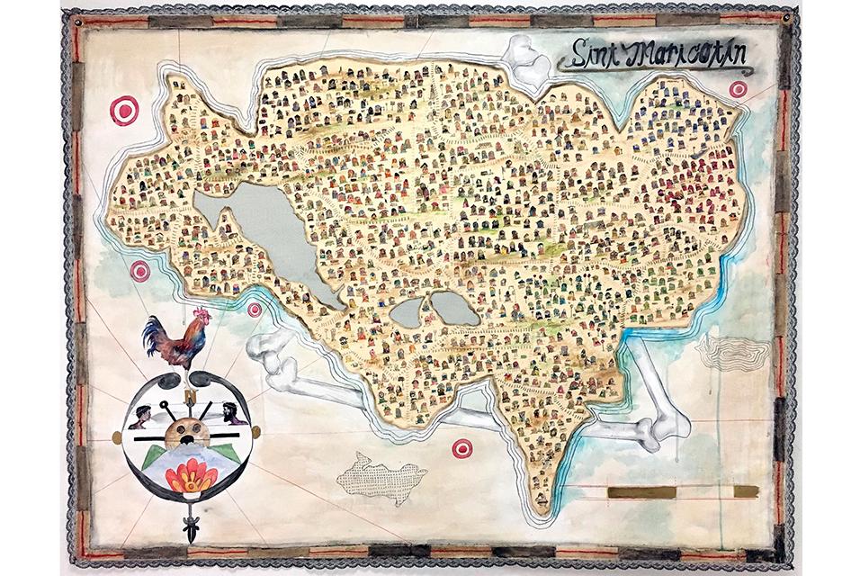 Nyugen Smith. Bundlehouse: Borderlines No.4 (Sint Maricotín), 2017. Pen, ink, watercolor, thread, colored pencil, acrylic, graphite, gesso, metallic marker, tea, Diaspora soil, and lace on paper. 48 x 54 inches. Courtesy the artist. Included in The Other Side of Now publication.
