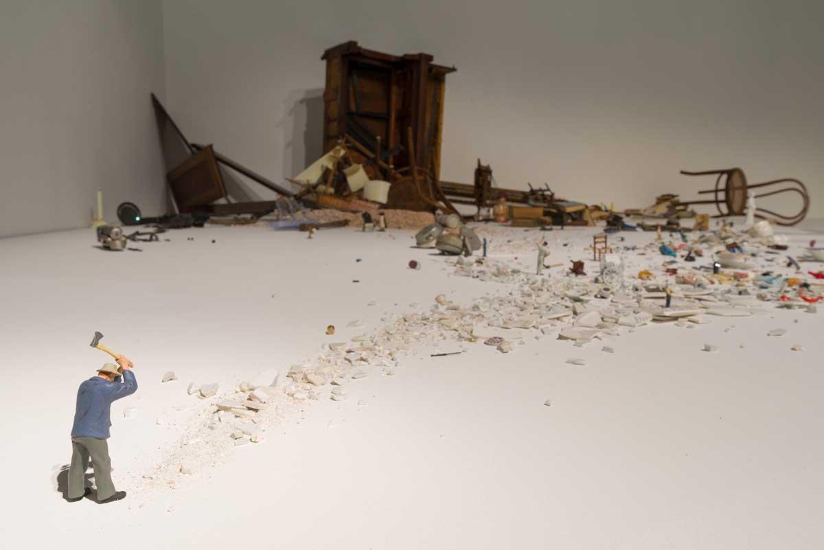 The piece’s title, “The man with the axe and other brief situations”, refers to a tiny plastic figurine of a man wielding an axe that is positioned prominently near the front-center of the installation. Within the scene, his tiny axe appears to have created a deep cut in the white ground beneath him and a large pile of broken materials. This “brief situation” is one of many that appear throughout the installation, creating a landscape of mini-narrative scenes across this expansive stage-structure that are at once humorous, odd, and philosophical.