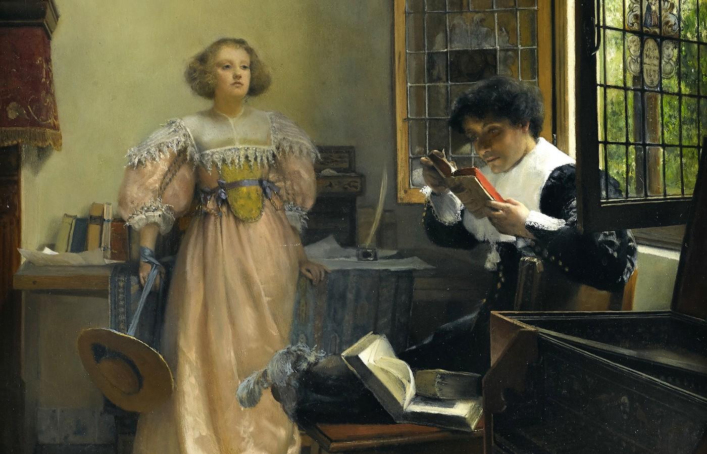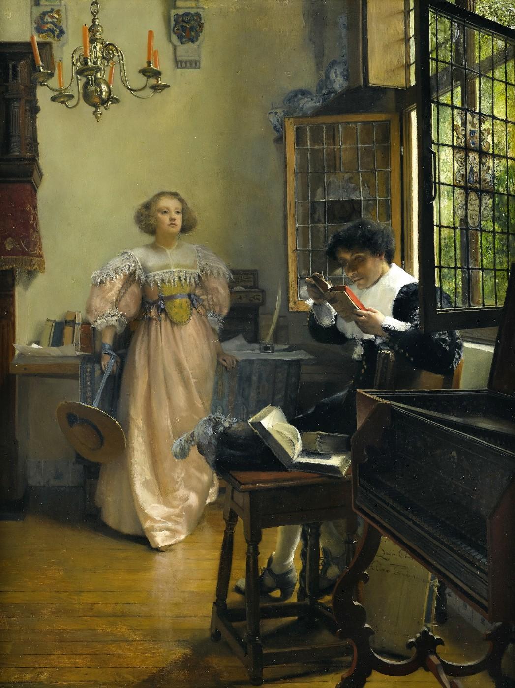 Her love for everything Dutch was conspicuous. The persistent reader illustrates figures pictured in a stylized 17th Century Dutch interior wearing period costumes. The cropped composition, the windowed light source, as well as the saturated colors are reminiscent of Johannes Vermeer, whose paintings Laura had studied on her trips to Holland. Laura Alma-Tadema's skill in depicting domestic interior scenes in Dutch settings was unparalleled and her talent was recognized throughout Europe. In 1896 she received the gold medal of the German government and one of her paintings was acquired for the Imperial collection. Like her husband Lawrence Alma-Tadema, Laura numbered her works in Roman numerals, but rarely dated them.