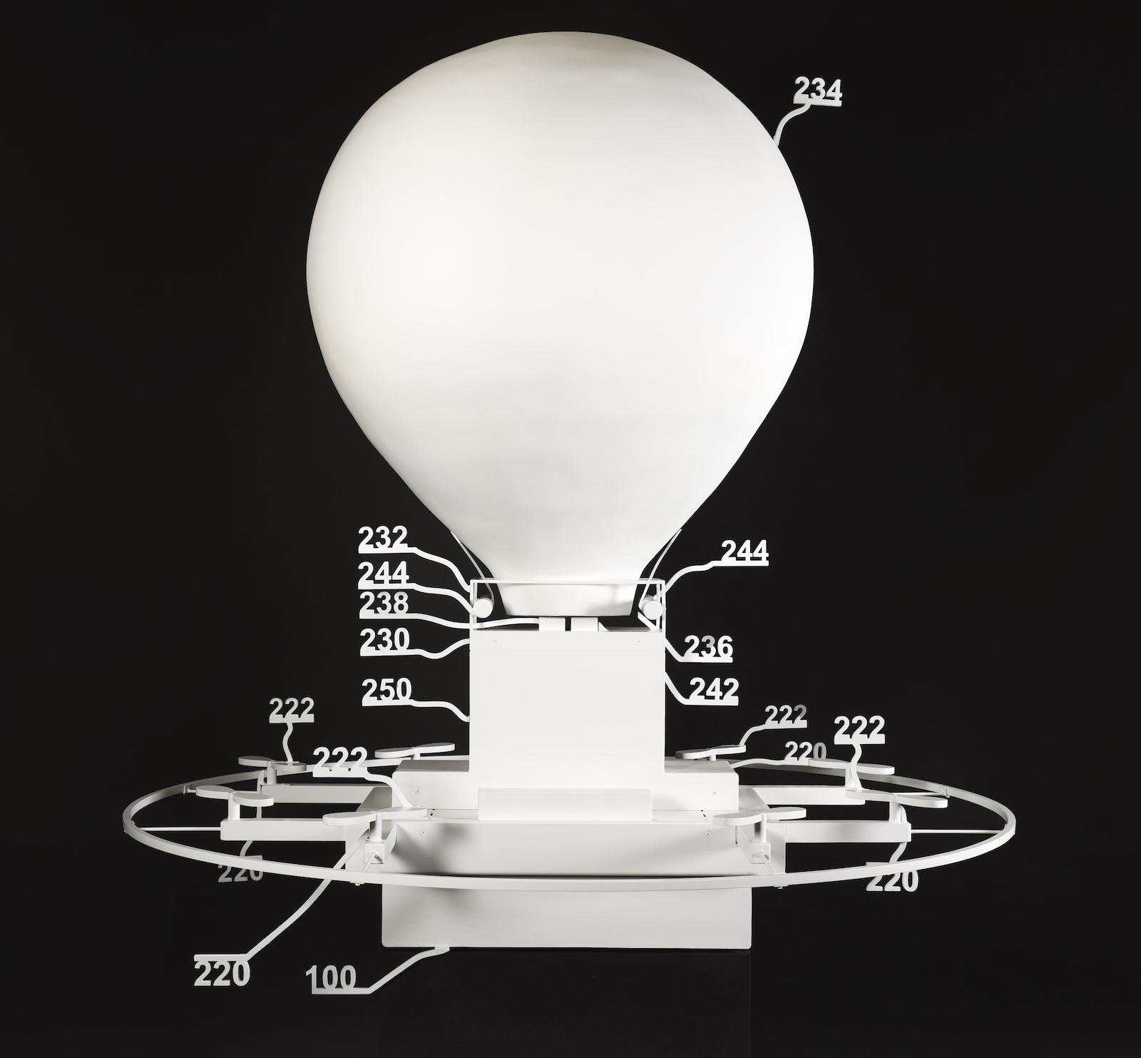 Amazon’s drone design contains a hot air balloon, recalling the speculative balloon-based flying machine epoch of defining technological developments such as hot air balloons, airships, or Zeppelins, that have become symbols of both achievement and caution in centuries past. Denny's new sculpture projects an animated AR model of a revolving, rocky, mineral-rich, planet Earth onto the drone’s balloon bulge.