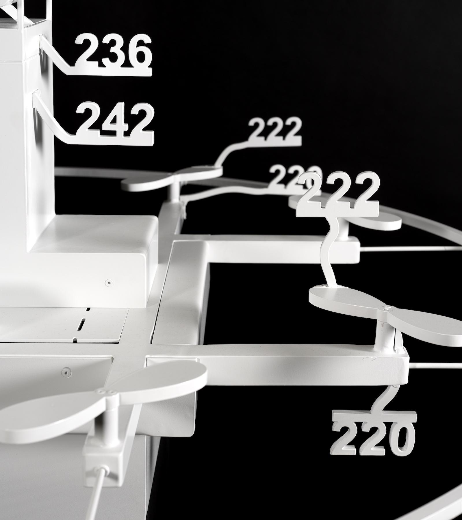 Focused on the interconnections between data mining, mineral mining, and the mechanization of labor, Mine brings together a collection of recent works including several large cardboard sculptures imitating giant automated mining machines; a series of wall-mounted paper reliefs and printed vitrines; and a new Augmented Reality sculpture based on a 2019 patent drawing filed by Amazon.com for a delivery worker replacement drone.